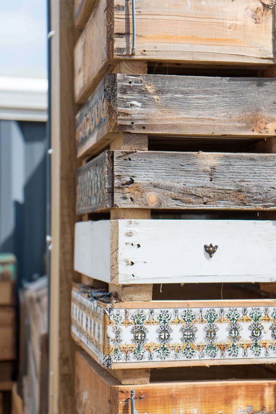 To recreate this fence on a budget, source reclaimed wood from local suppliers or construction sites and use simple screws for assembly. Adding some vintage tiles or paint can elevate the design without significant expense.