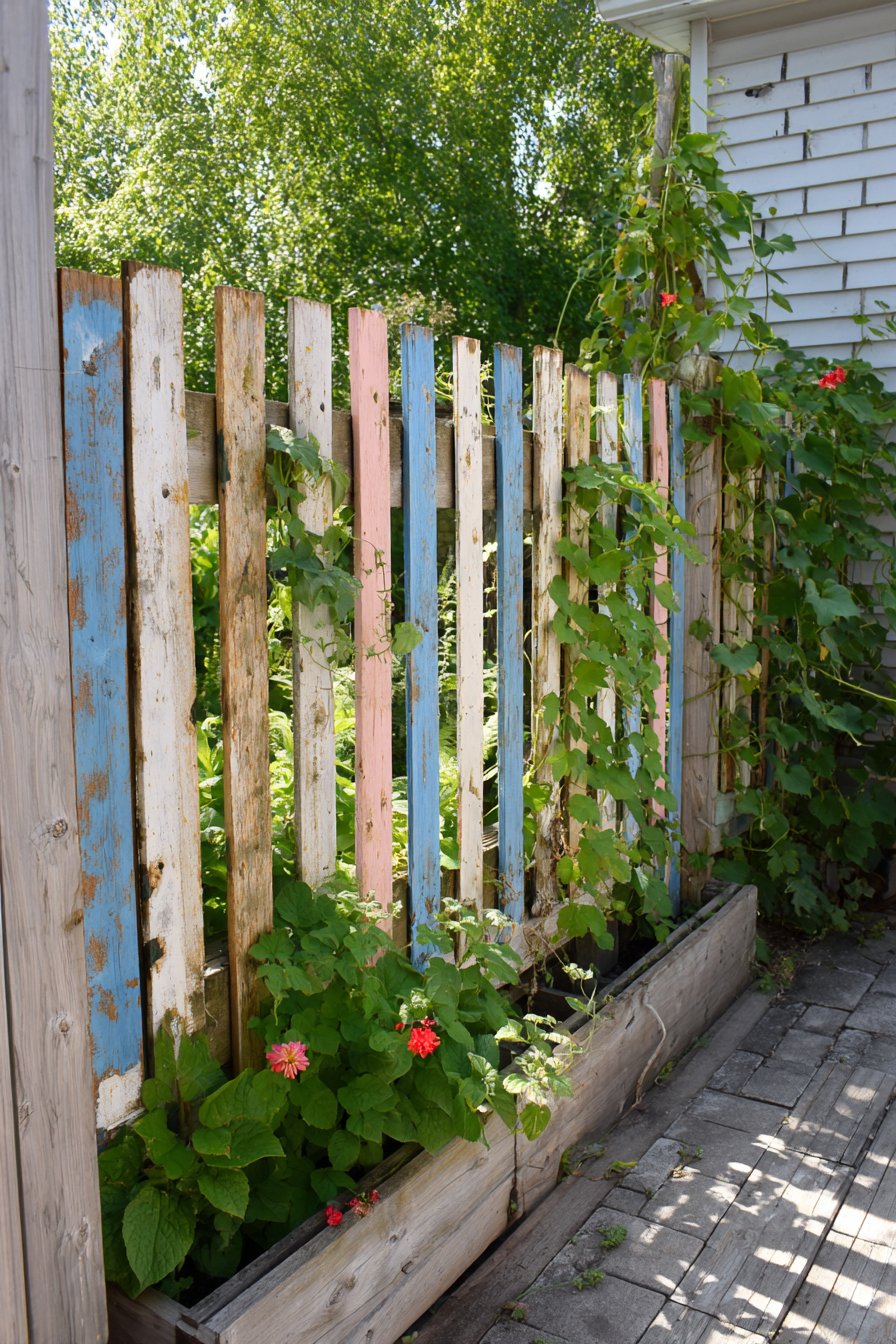 The rustic reclaimed wood fence beautifully combines natural textures and weathered hues, creating a warm, inviting atmosphere perfect for any garden space. Incorporate colorful tiles and decorative accents to enhance visual interest while allowing climbing plants to soften the structure.