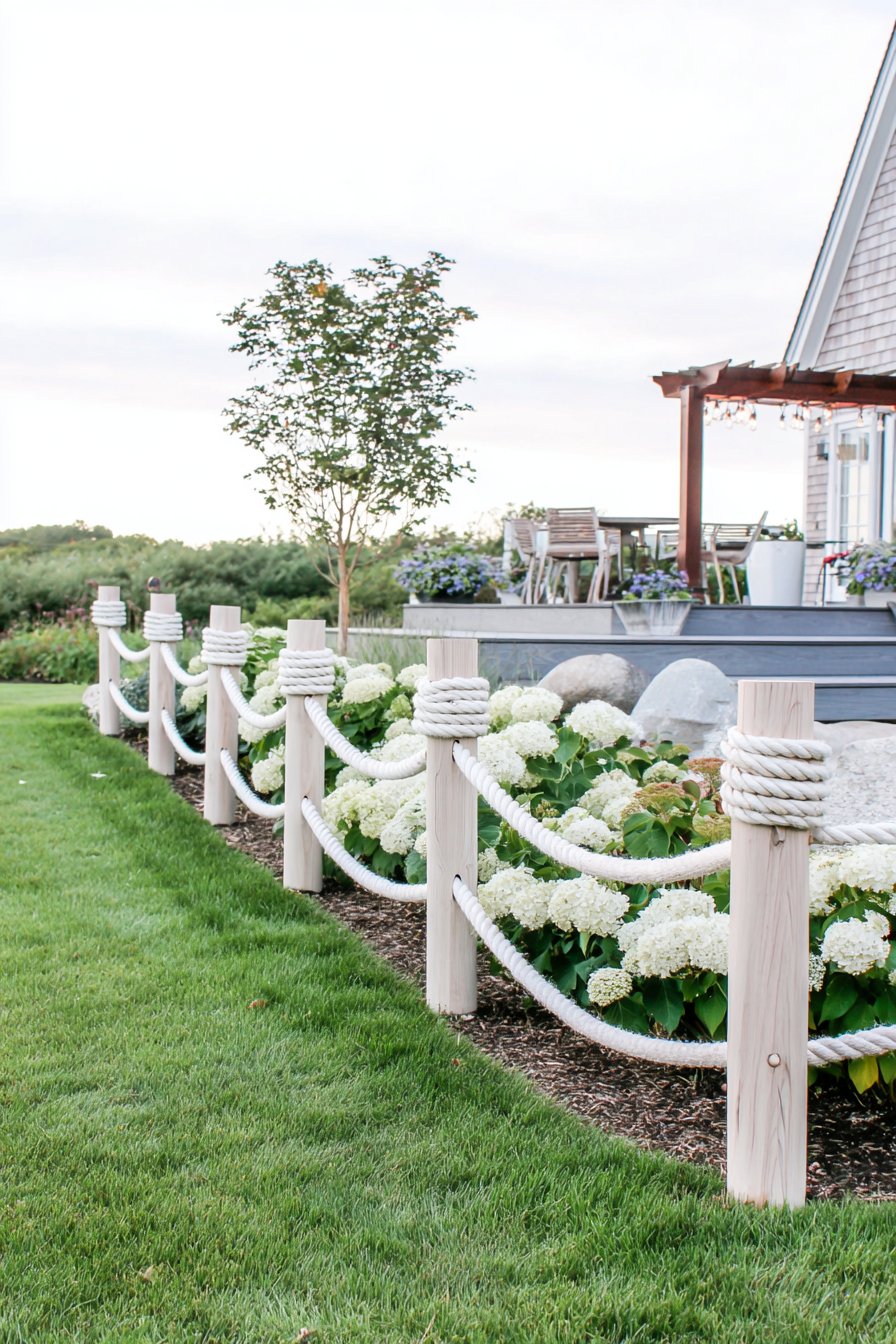 The rustic wooden fence, bound with thick rope, adds a charming coastal vibe, enhanced by the warm tones of the timber and the lush greenery nearby. To recreate this inviting look, pair natural wood posts with durable, weather-resistant rope, and consider planting vibrant flowers or grasses for added texture and color.