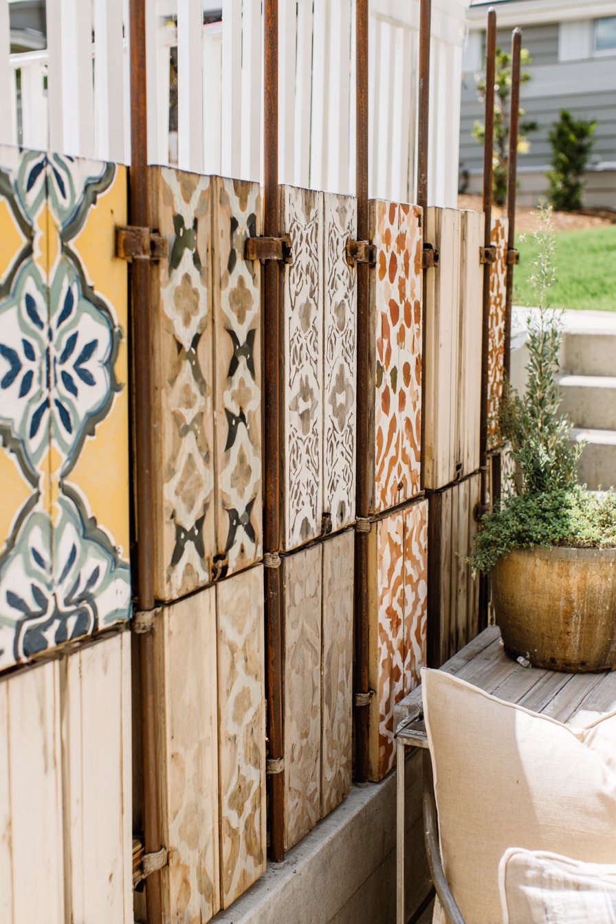 To recreate this look on a budget, use reclaimed wood for the panels and paint them with stencils for unique patterns. Combine with inexpensive metal piping for support, ensuring a stylish yet cost-effective fence.