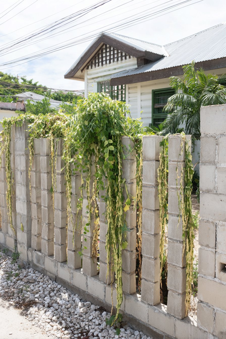 To recreate this fence on a budget, purchase concrete blocks from a local supplier and use climbing plants like vines for greenery. A simple gravel base can enhance drainage and add to the overall look.