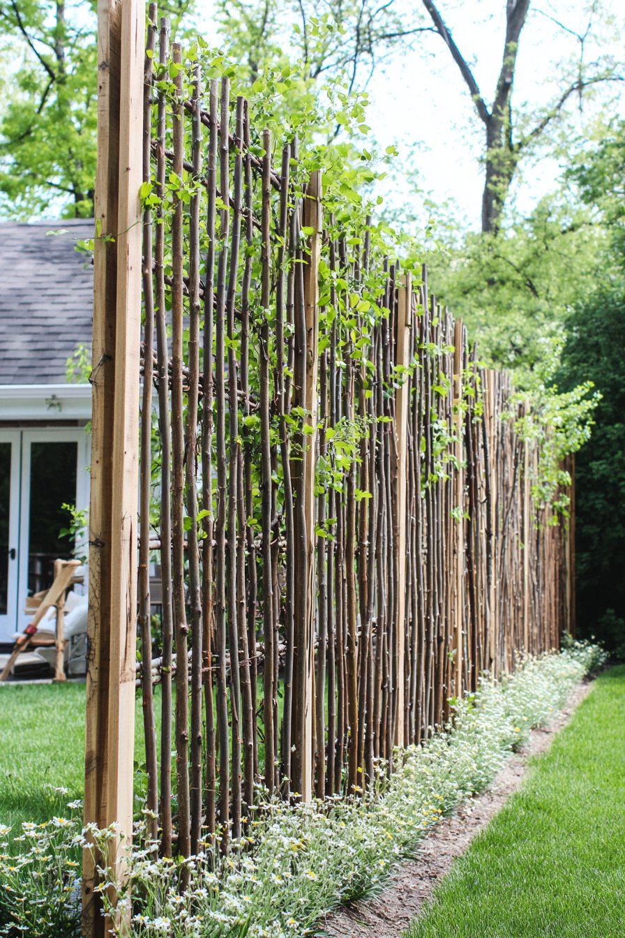 To recreate this fence on a budget, gather fallen branches or bamboo stakes, and secure them between wooden posts using twine or wire. Plant fast-growing vines at the base to enhance the natural aesthetic and provide coverage quickly.