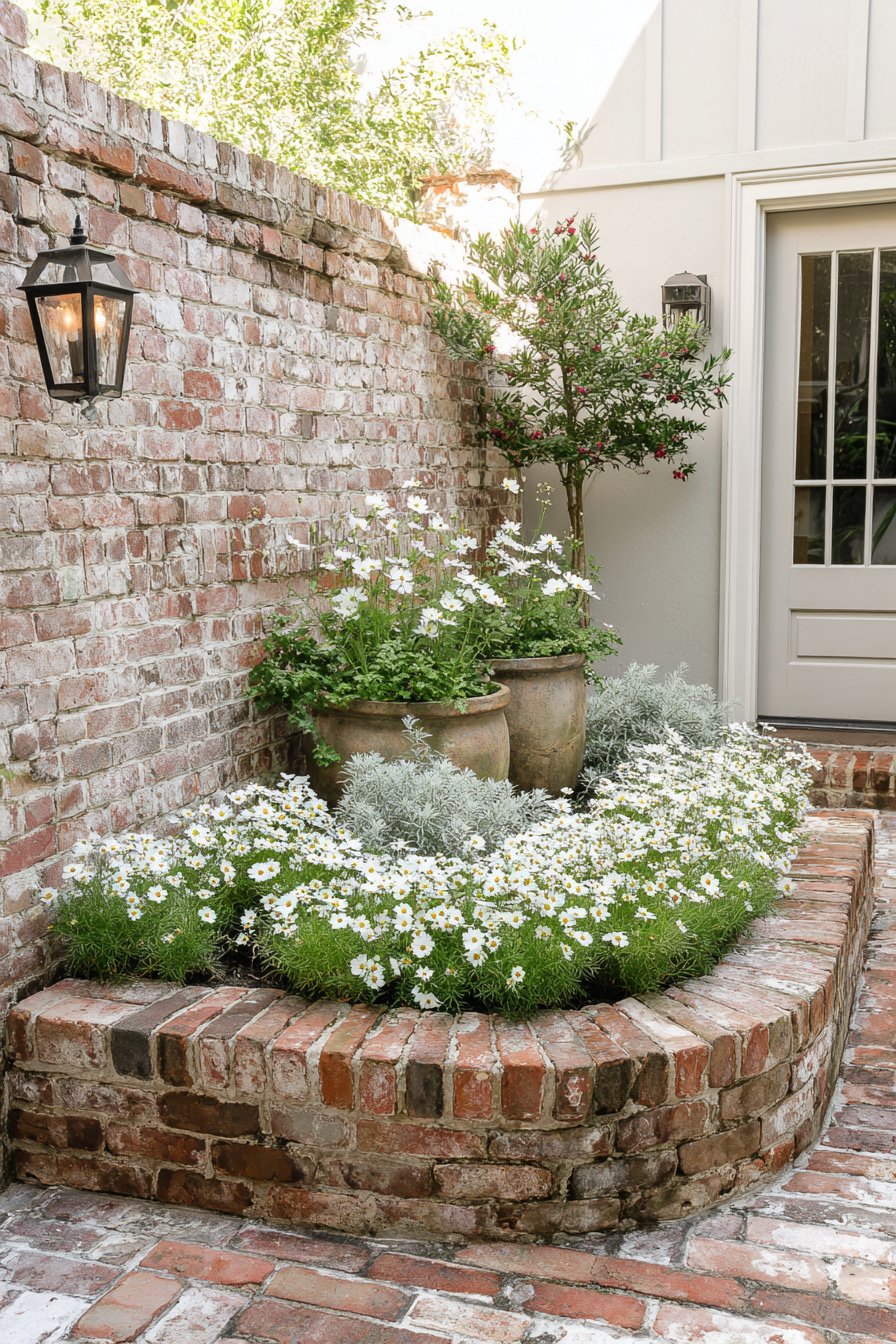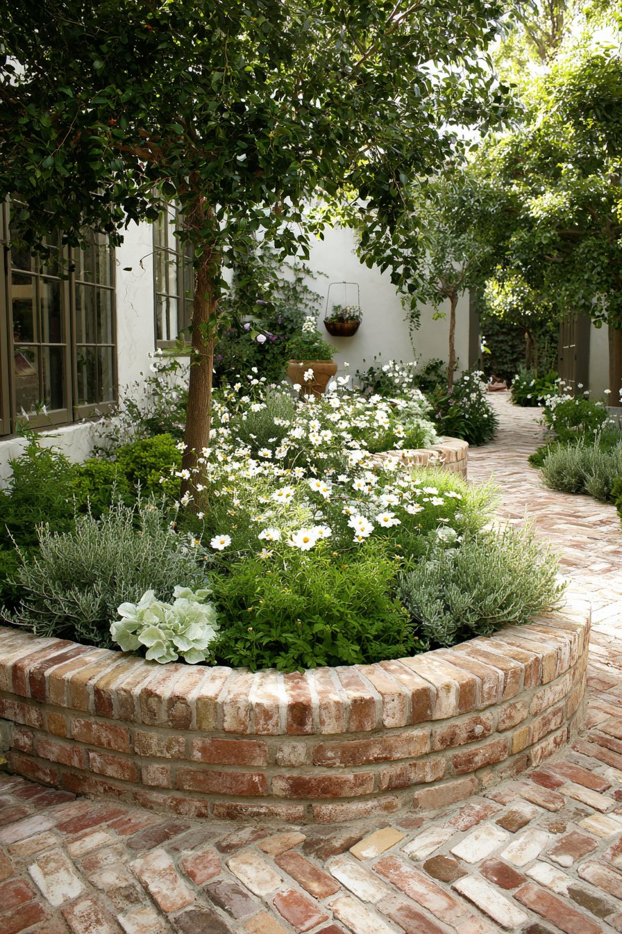 The curved brick border adds a charming touch, perfectly framing vibrant white flowers and soft silvery foliage for a delightful contrast. Use rustic pots for added height and interest, and choose low-maintenance plants for an easy-care garden.