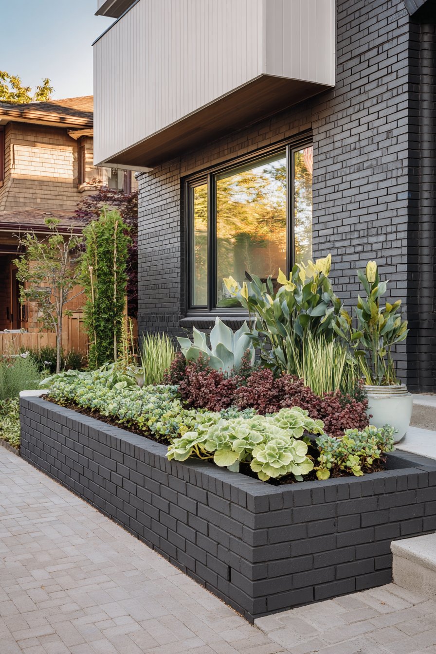 The modern brick flower bed border adds a sleek touch with its dark tones, perfectly framing vibrant greens and rich burgundies. For a similar look, mix low-maintenance plants like succulents and ornamental grasses with colorful foliage in a well-defined space.