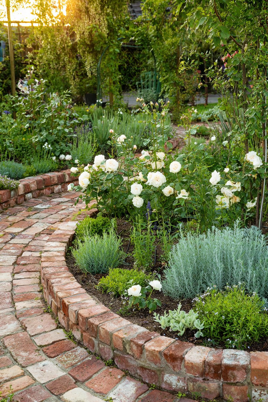 The curved brick border adds a charming touch, framing lush greenery and delicate white roses beautifully. Mix herbs like lavender and sage with flowers for color and texture, and consider a similar brick layout for your own garden.
