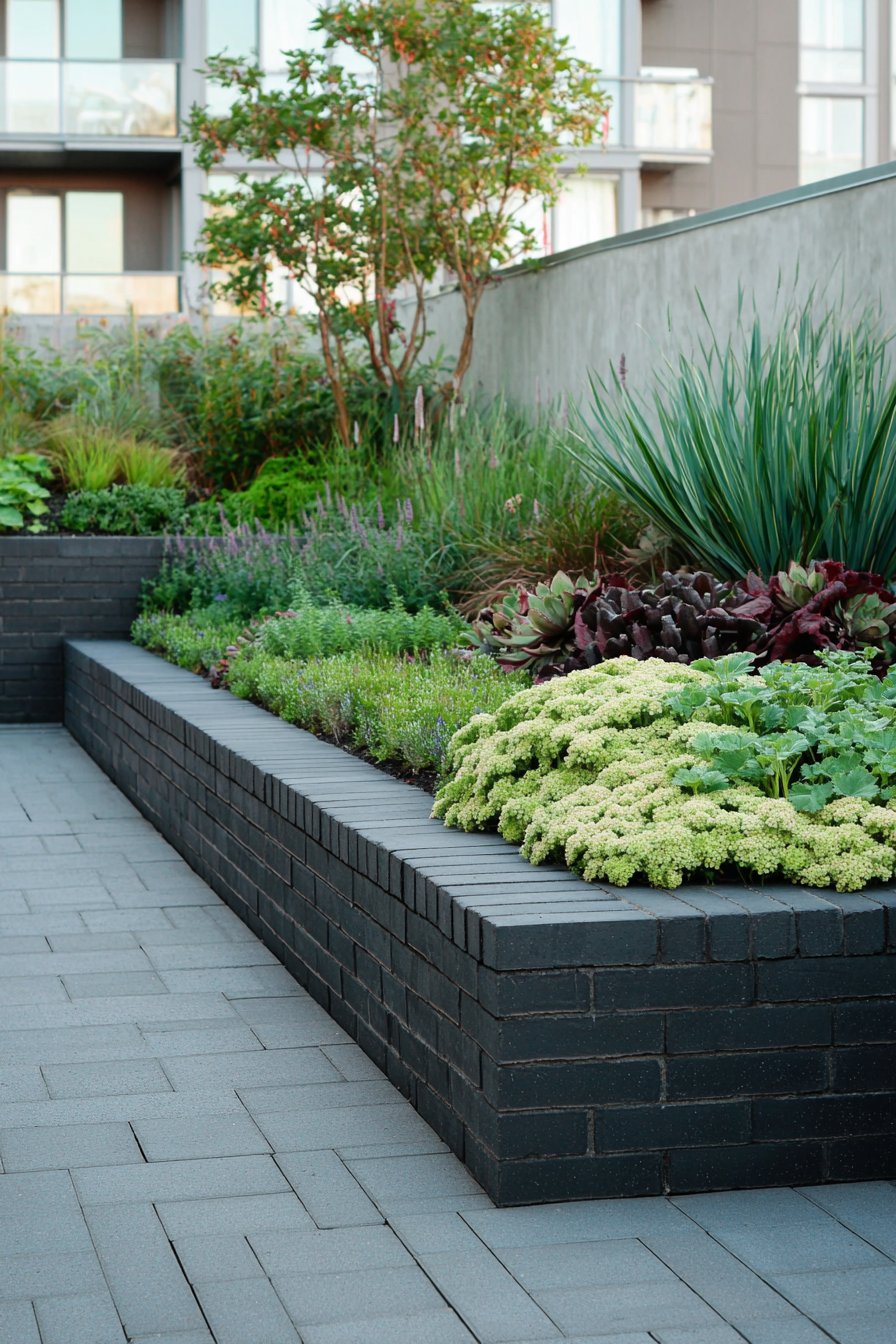 The sleek black brick border adds a modern touch, perfectly framing lush greenery and vibrant textures for a striking contrast. To achieve this look, mix low-maintenance plants like sedums and heucheras with taller grasses for depth and interest.