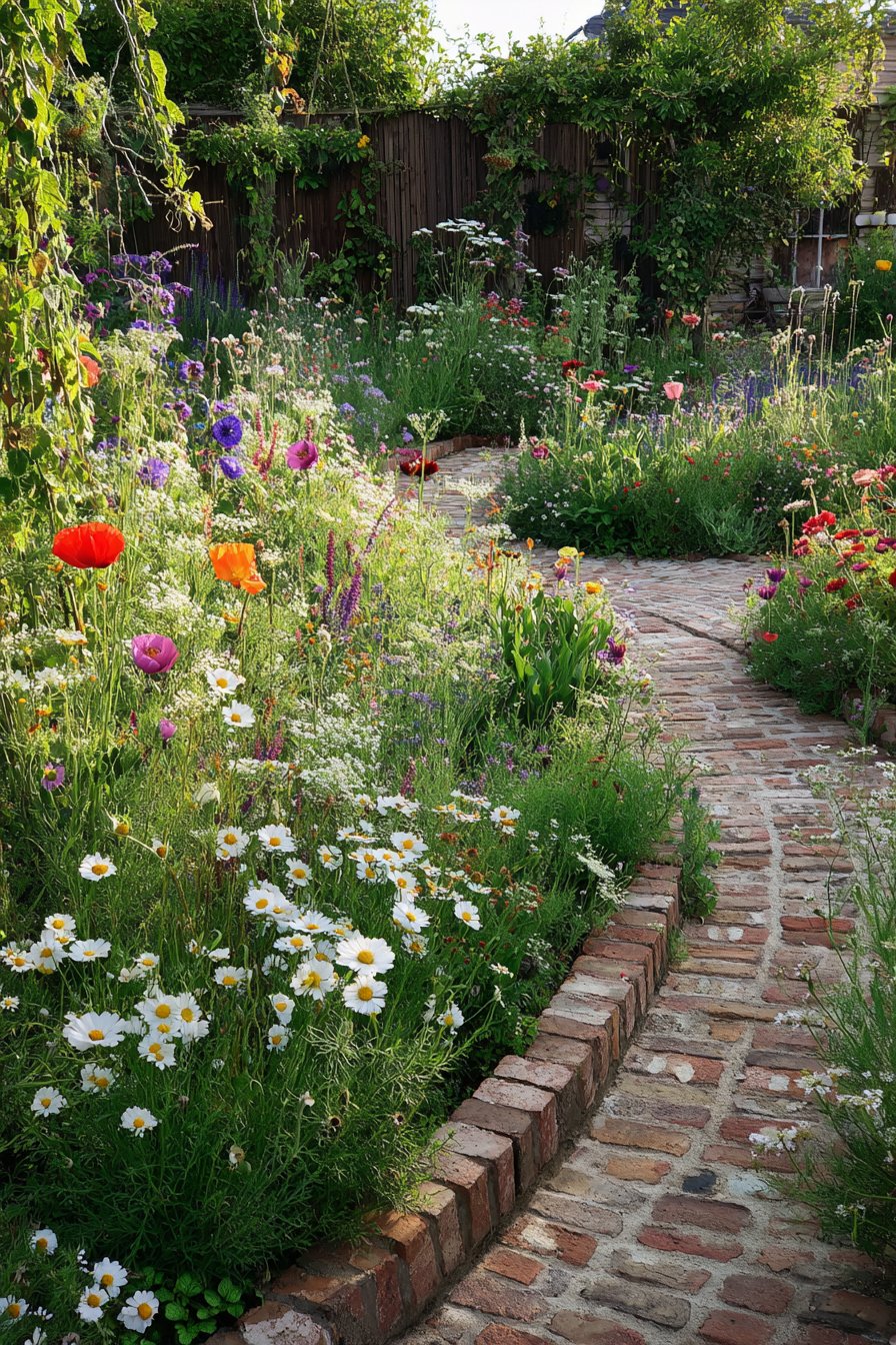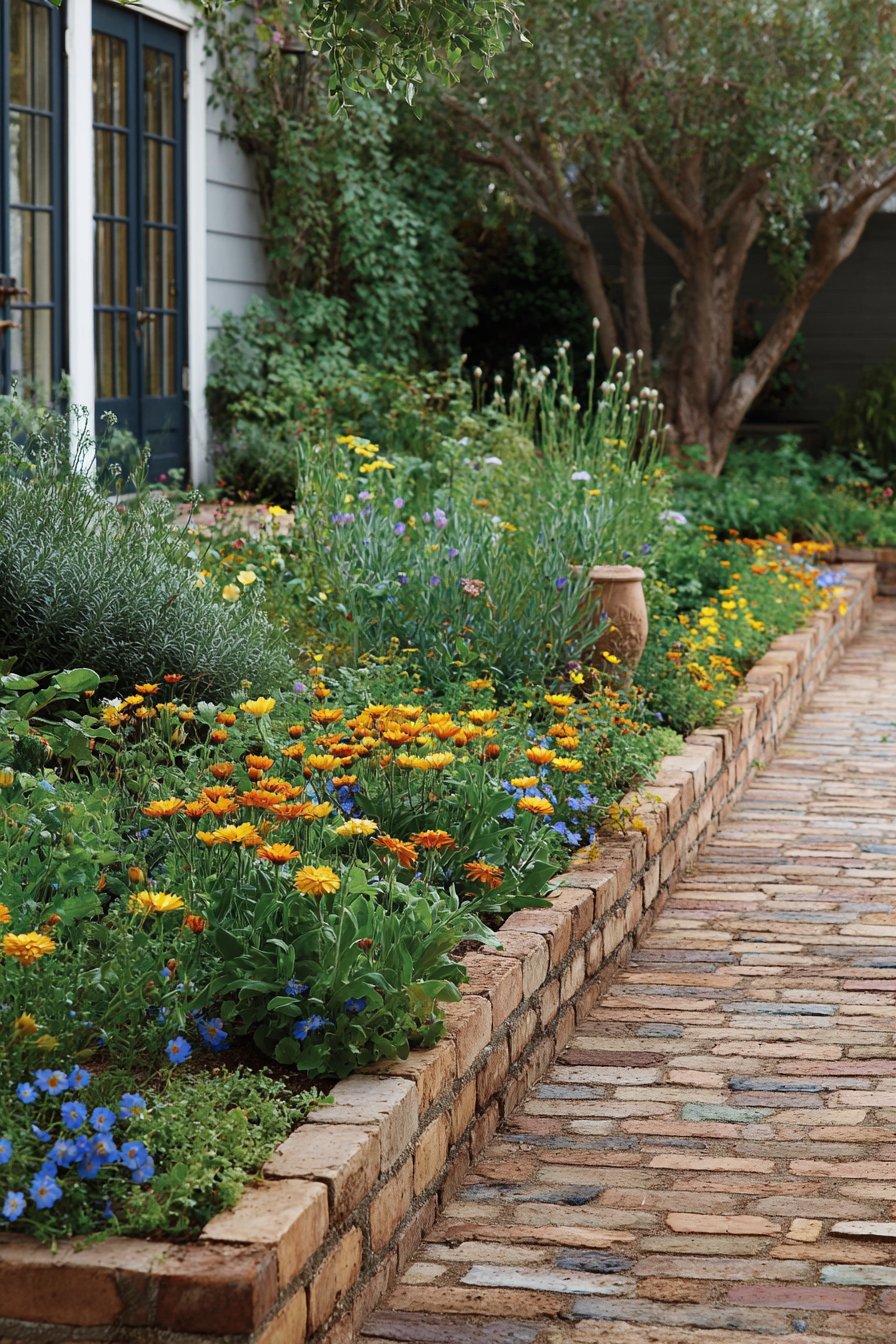 The rustic brick border adds warmth and charm, perfectly framing the vibrant mix of colorful flowers like poppies and daisies. To recreate this look, use reclaimed bricks for a natural feel and choose a variety of blooms for year-round interest.