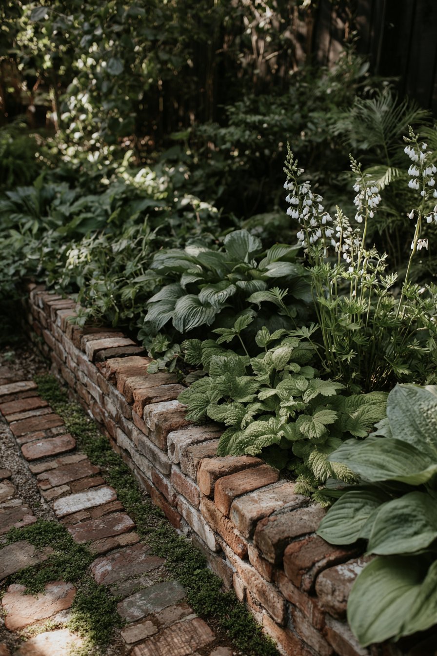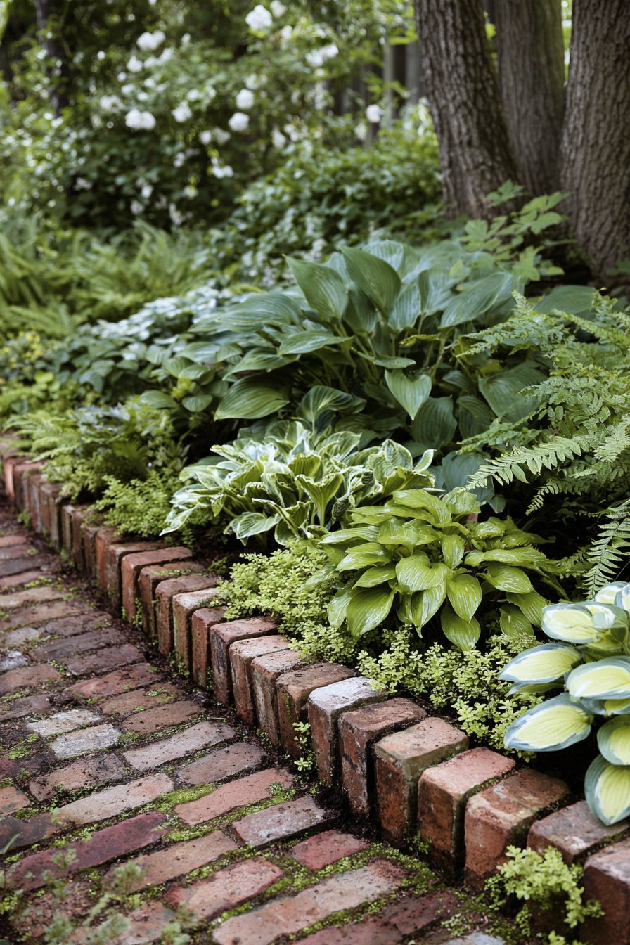 The rustic brick border adds charm and warmth, perfectly framing lush greenery and vibrant hostas. For a similar look, mix varied leaf textures and colors while keeping your bricks slightly weathered for that cozy feel.