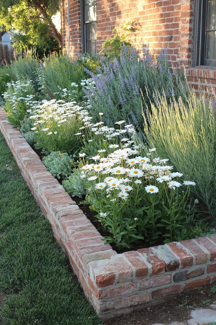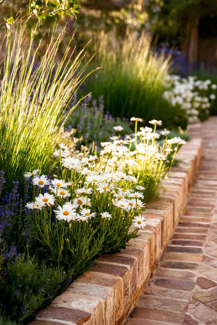 The rustic brick border adds warmth and charm, perfectly framing vibrant daisies and soft lavender that create a cozy, inviting feel. To replicate this look, mix perennials like daisies with ornamental grasses for texture and color.