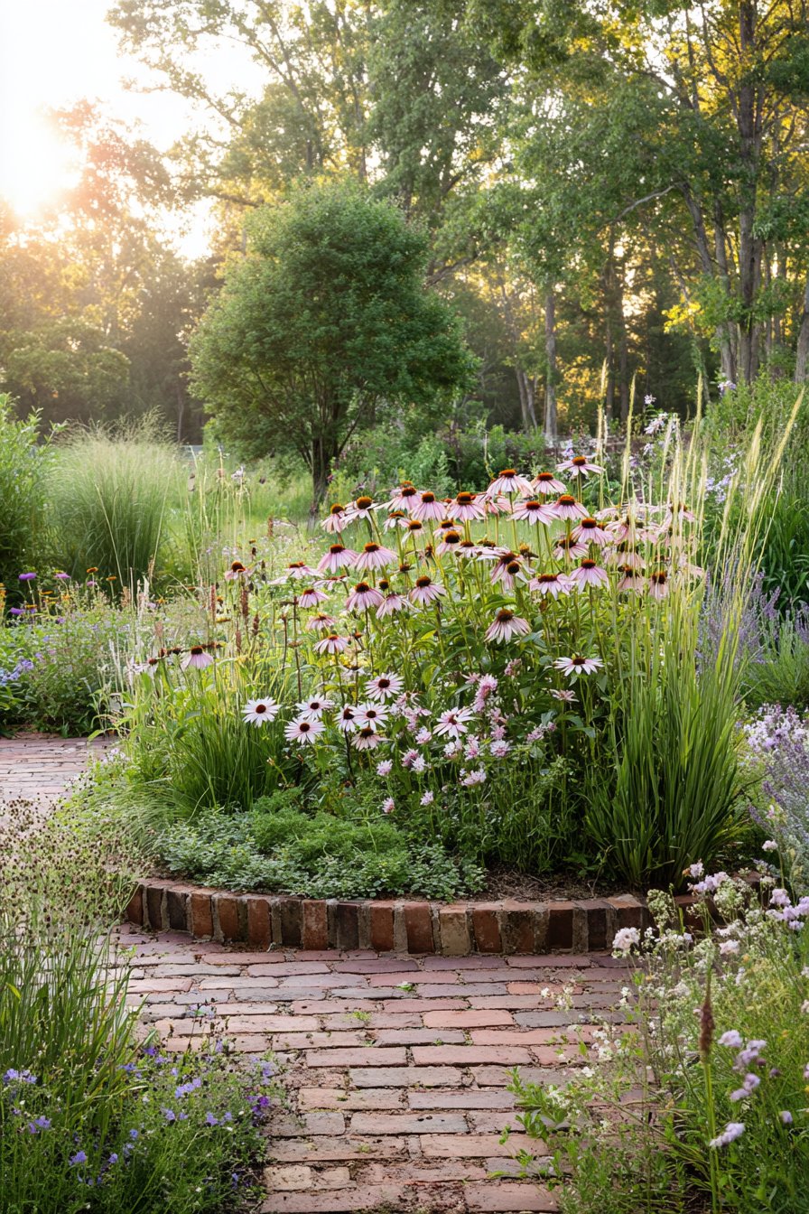 The curved brick border adds a charming touch, framing vibrant flowers like echinacea and delicate grasses that dance in the breeze. For a similar look, mix perennial flowers with low-growing ground covers and use bricks for a natural, rustic edge.