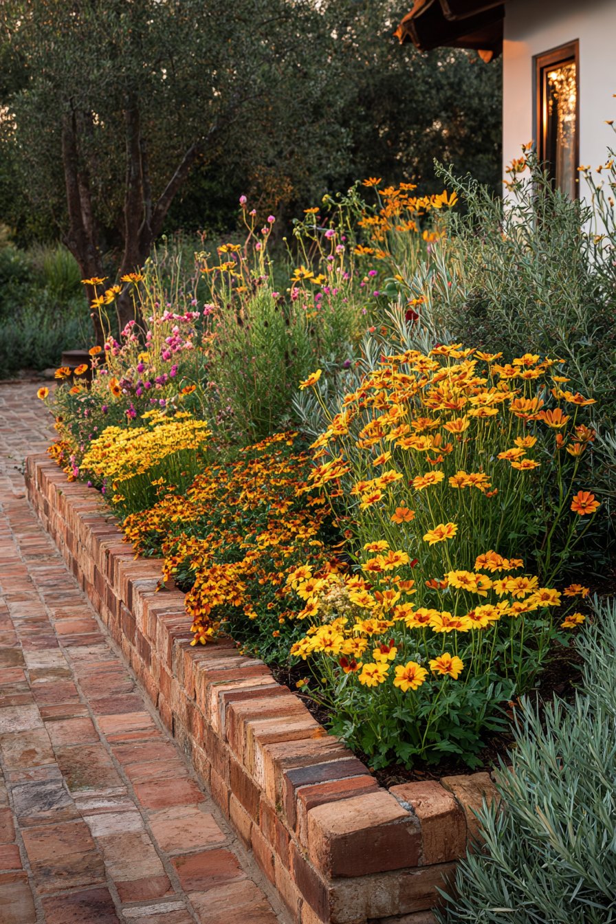 The rustic brick border adds warmth and texture, perfectly complementing the vibrant yellows and oranges of the flowers. For a similar look, mix low-growing plants with taller blooms to create layers and visual interest.