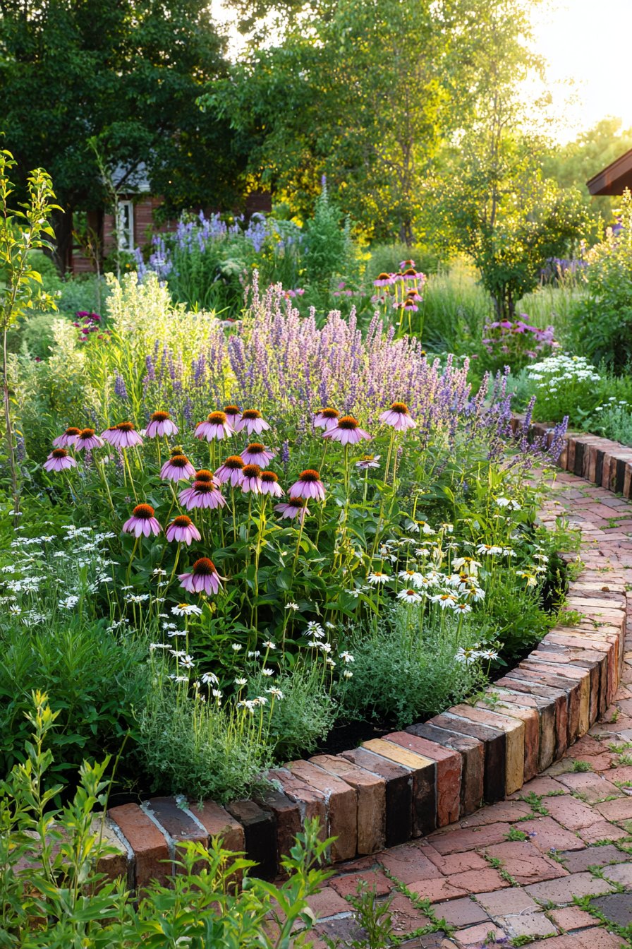 The curved brick border adds a charming touch, perfectly framing vibrant Echinacea and delicate daisies while creating a cozy garden vibe. For a similar look, mix perennials with different heights and use rustic bricks for a natural feel.