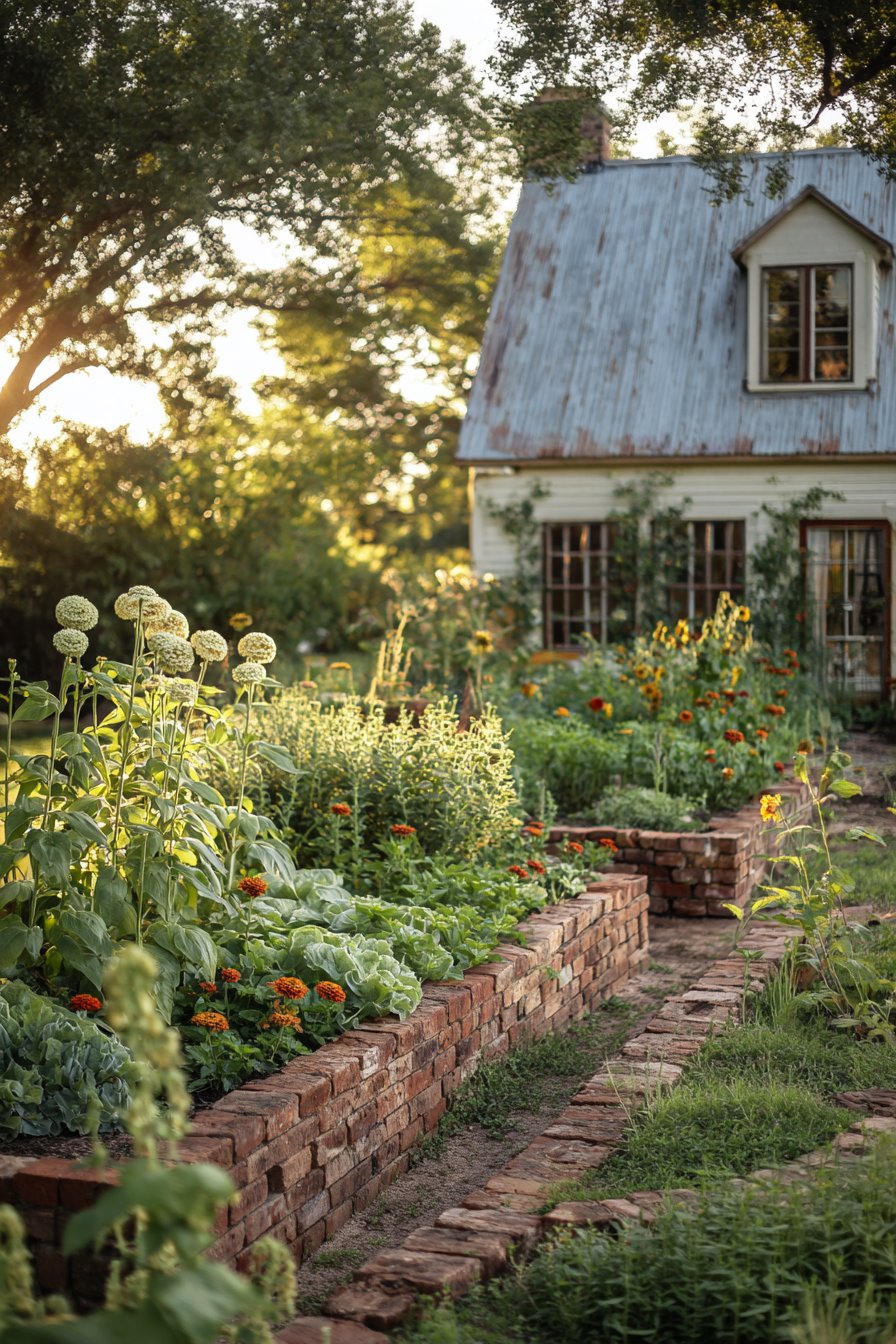The rustic brick border adds warmth and structure, beautifully framing vibrant flowers and lush greens. For a similar look, use reclaimed bricks and mix colorful blooms like marigolds and sunflowers with leafy plants.