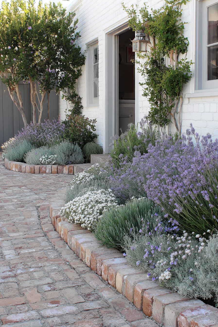 The curved brick border adds a rustic charm, framing soft lavender and white flowers that create a soothing color palette. For a similar look, use low-maintenance plants like lavender and alyssum, and choose warm-toned bricks for a cozy feel.