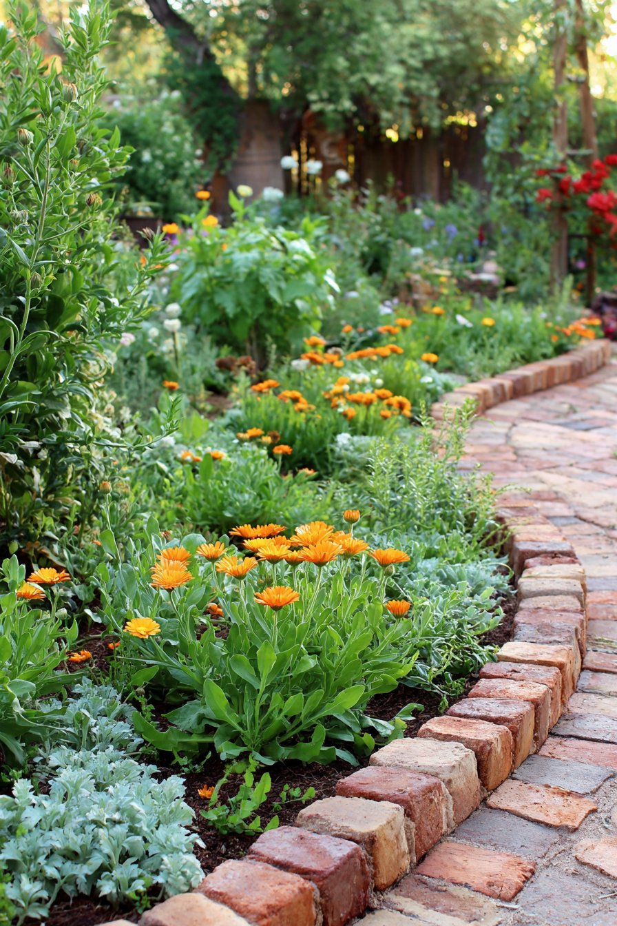 The curved brick border adds a charming touch, nicely framing vibrant marigolds and lush greenery for a lively garden feel. To replicate this look, use durable bricks for edging and mix marigolds with low-maintenance plants for color and texture.