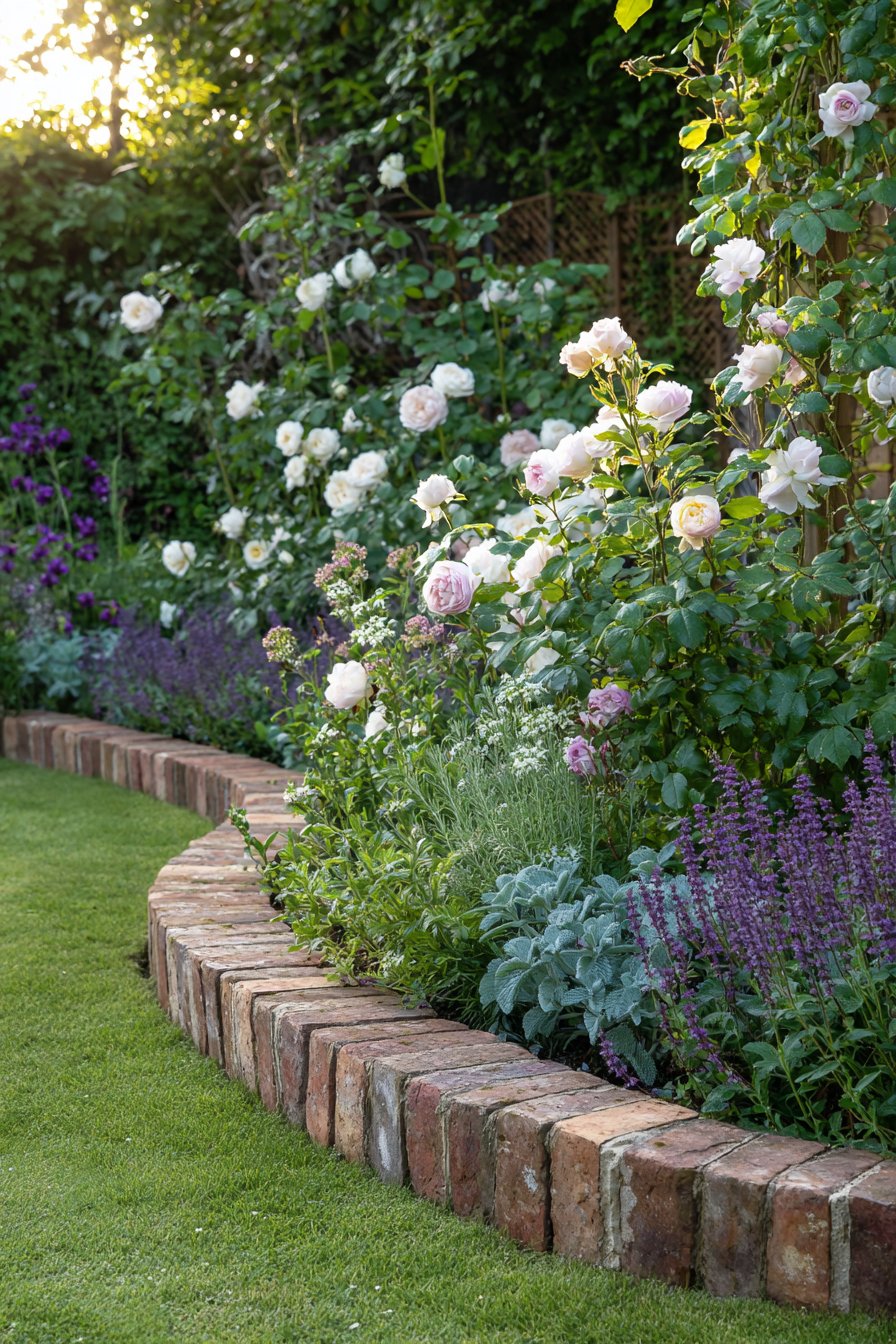 The curved brick border adds warmth and charm, beautifully framing soft pink roses and vibrant purple flowers. To recreate this look, mix perennial plants with varied heights and textures for a lush, inviting garden.
