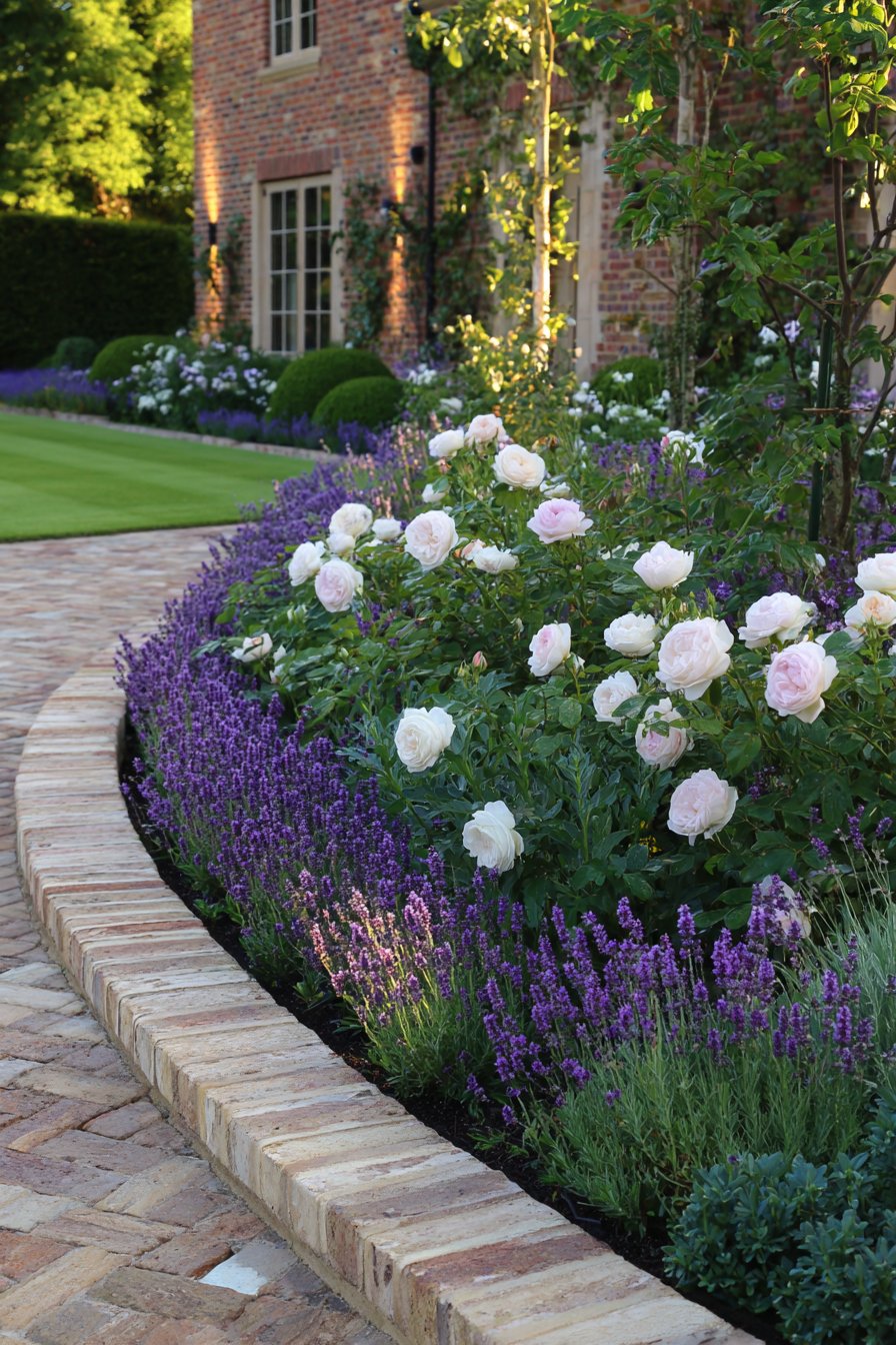 The curved brick border adds a lovely structure and warmth, while the lavender and soft pink roses create a soothing color palette. To achieve this look, combine low-maintenance lavender with classic roses and use a sturdy brick edge for a polished finish.