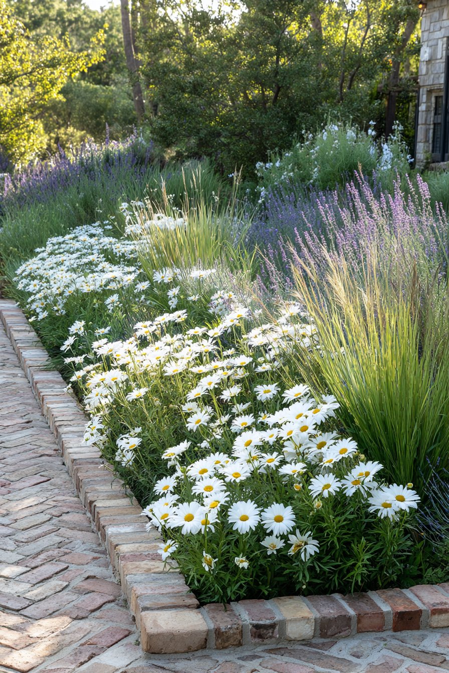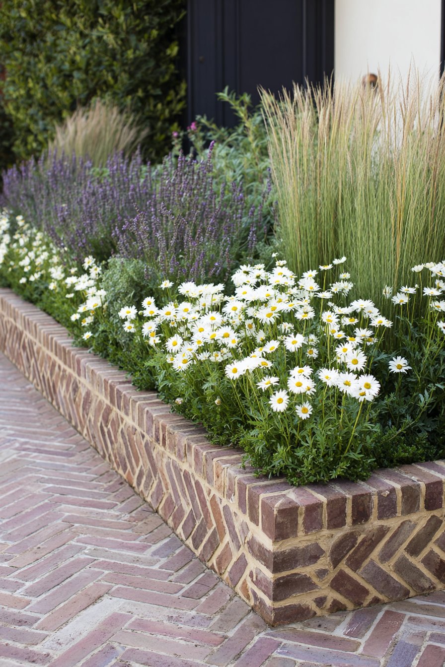 The charming brick border frames a vibrant mix of white daisies and soft lavender, creating a welcoming and lively garden space. For a similar look, plant daisies for brightness and lavender for texture, while using bricks to define your flower beds.