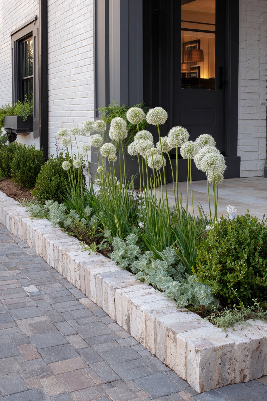The stacked brick flower bed border adds a rustic charm, contrasting beautifully with the lush greenery and white blooms. For a similar look, combine hardy plants like alliums and low-maintenance ground covers in a neat, layered arrangement.