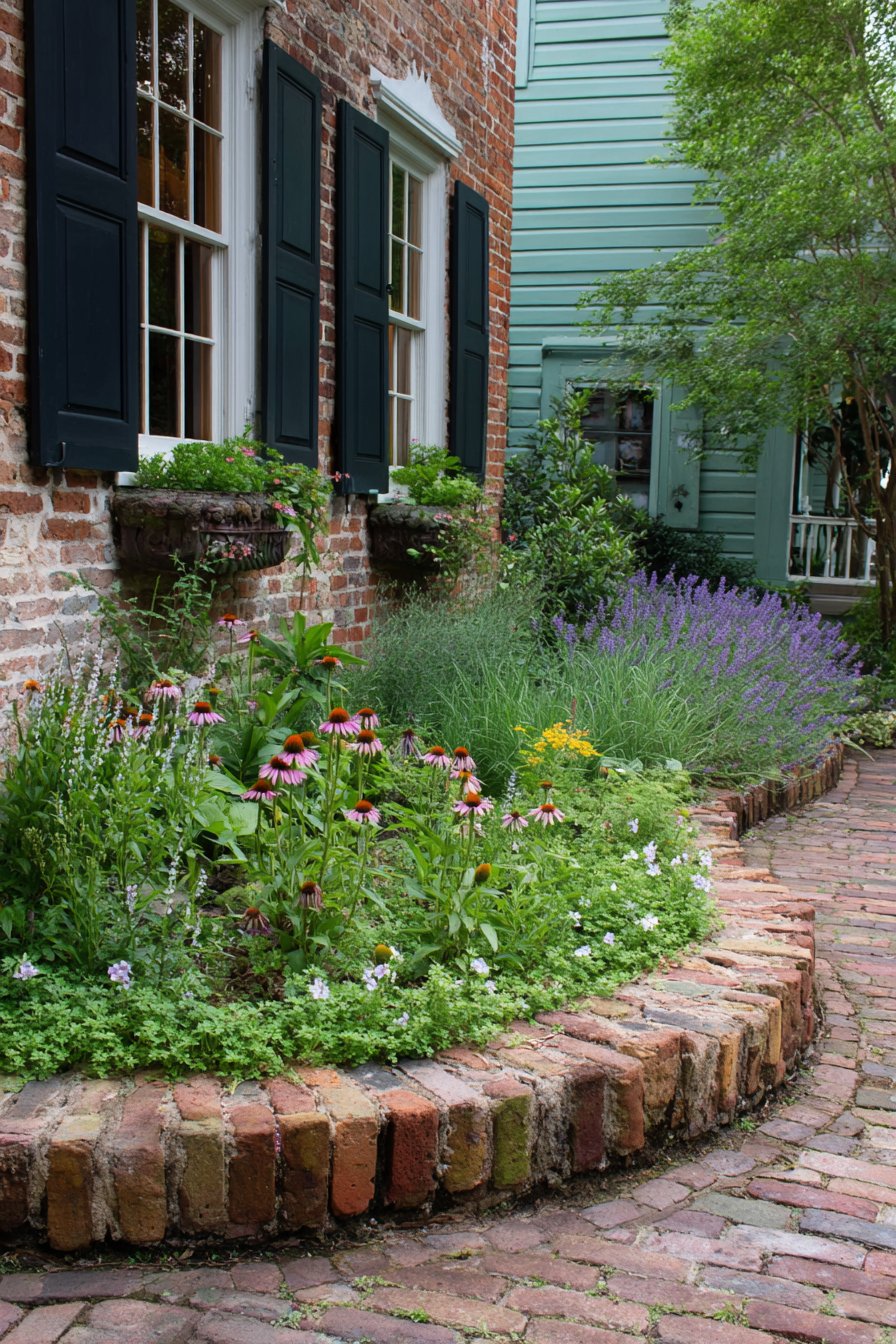 The curved brick flower bed border adds warmth and texture, beautifully framing vibrant plants like echinacea and lavender. To recreate this look, mix perennial and annual flowers with a natural stone border for a charming, inviting garden space.