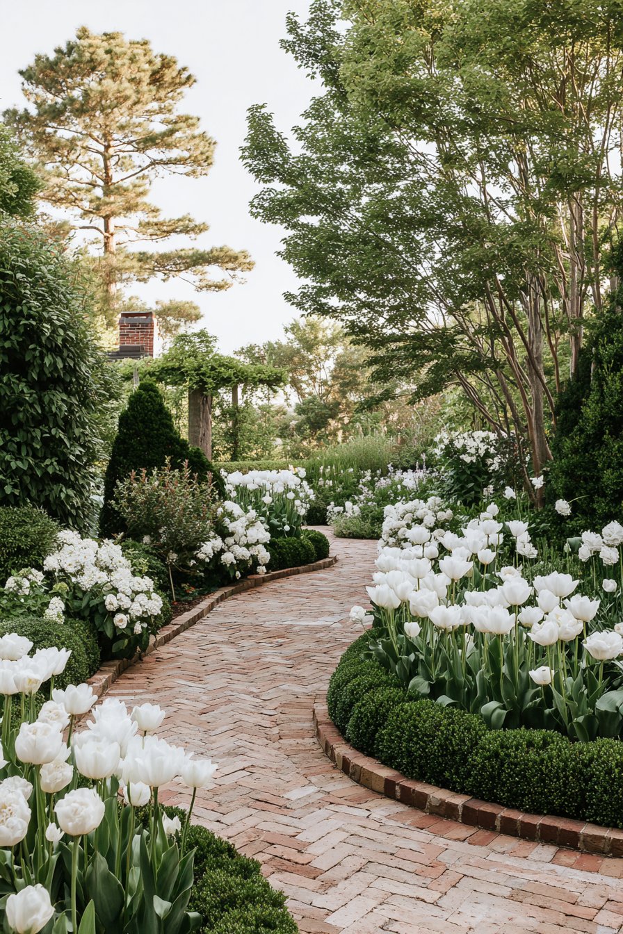 The curved brick flower bed border adds warmth and structure, perfectly framing lush white tulips and hydrangeas for a fresh, clean look. For a similar vibe, mix perennial flowers with evergreen shrubs and use warm-toned bricks to create inviting pathways.