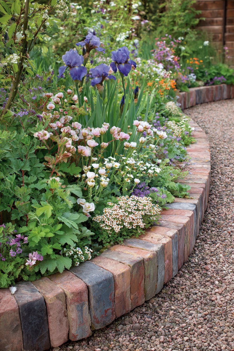 The curved brick border adds charm and structure to the garden, perfectly framing vibrant blooms like irises and daisies. For a similar look, use varied colors in your bricks and mix perennials with ground covers for a lush, layered effect.