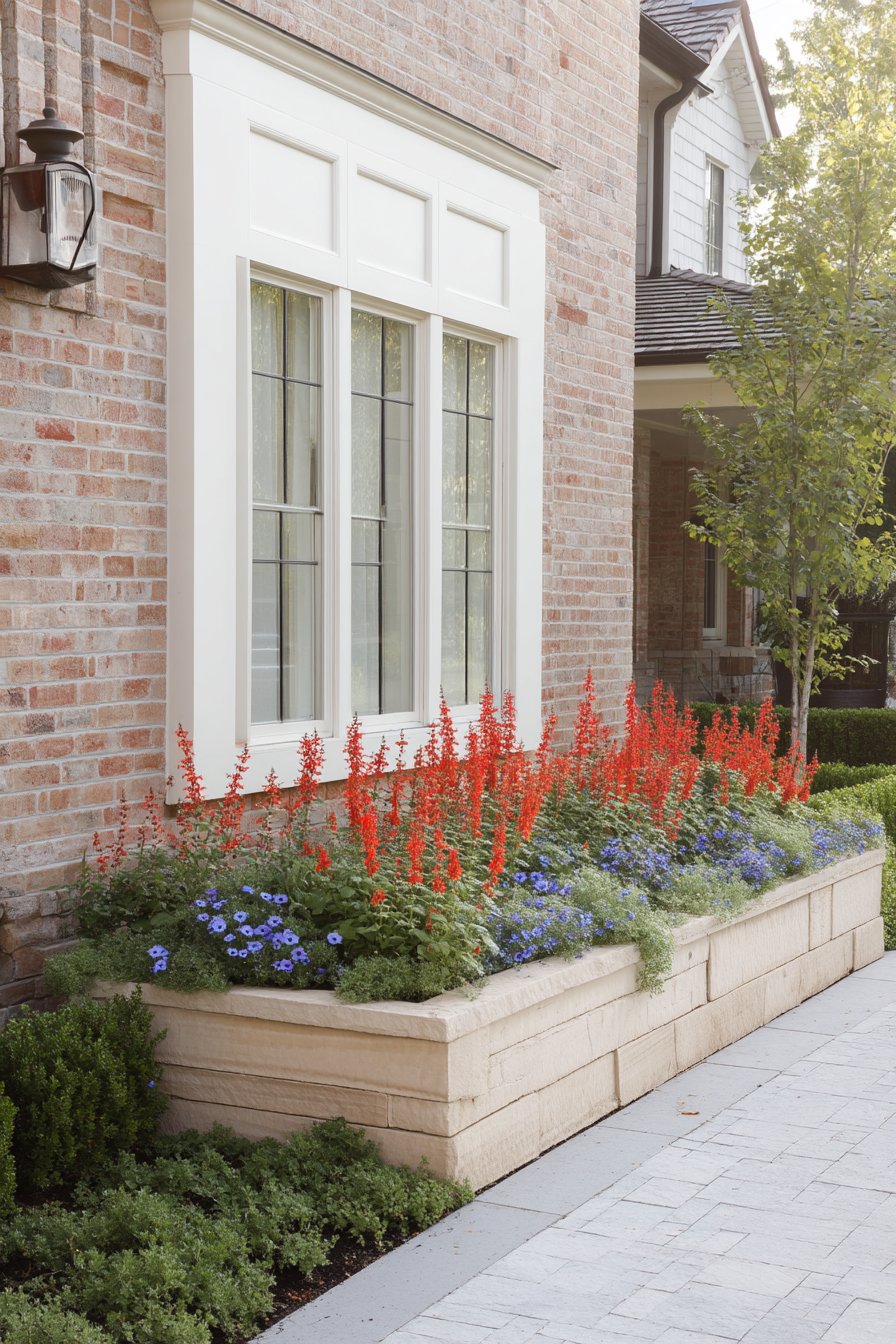 Bold red salvia contrasts beautifully with soft blue lobelia, creating a vibrant color palette that energizes any space. To replicate this look, choose low-maintenance flowering plants and consider raised beds for added structure and visual interest.