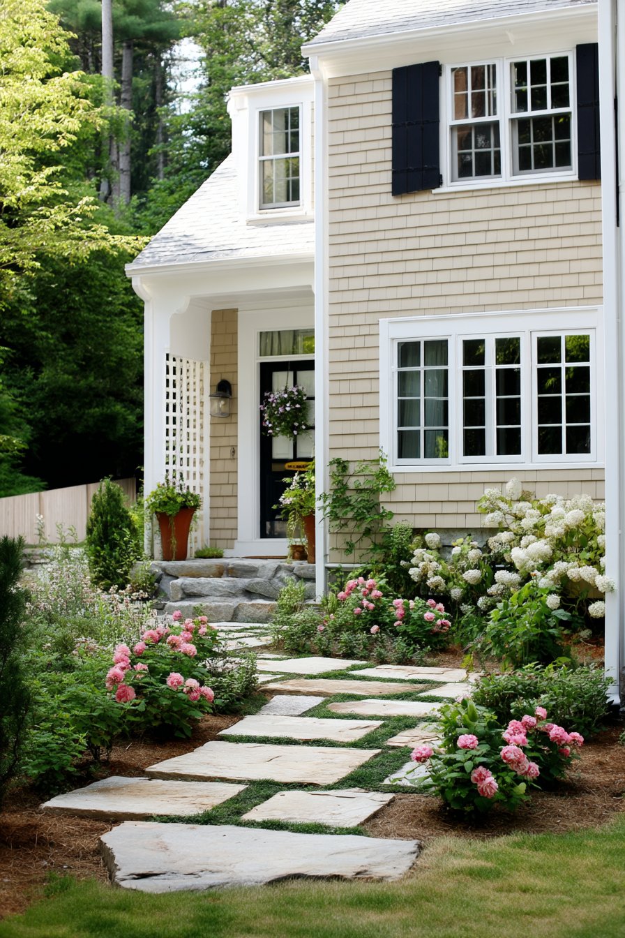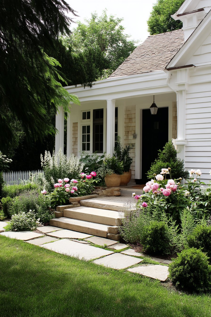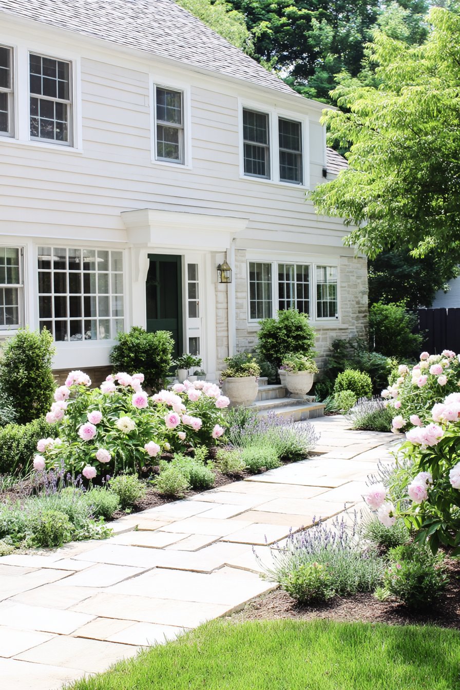A charming blend of lush in soft pinks and whites creates a romantic entrance, harmonizing beautifully with the natural stone pathway. To replicate this look, consider mixing perennials and evergreens for year-round interest and plant in generous clusters for a fuller effect.