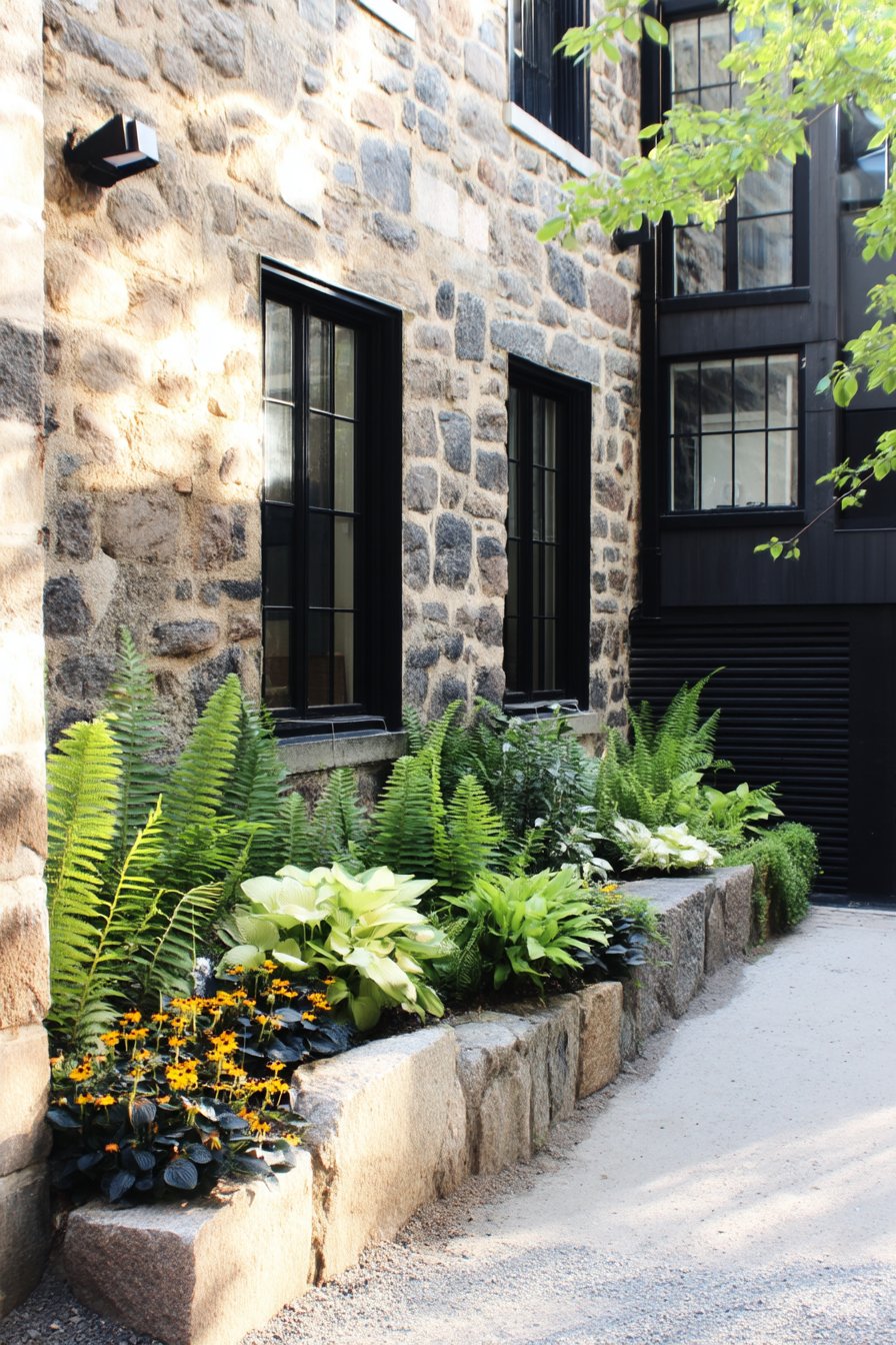 The vibrant black-eyed Susans beautifully contrast with the lush ferns, creating a lively yet serene atmosphere. To replicate this look, mix different fern varieties with cheerful, sun-loving flowers in a shaded or partially shaded area.