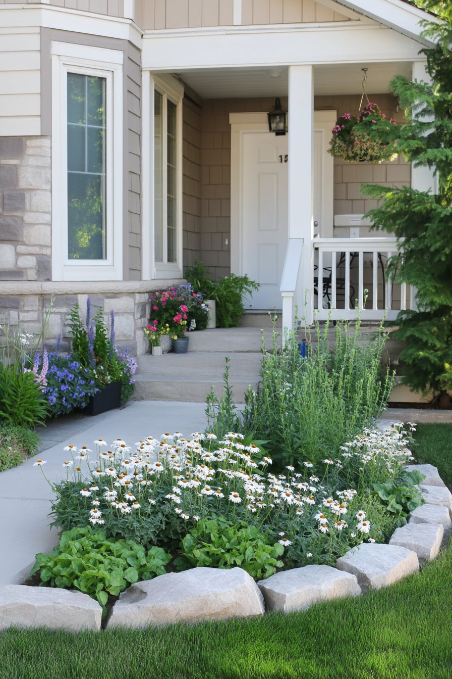 The vibrant white daisies create a cheerful focal point, beautifully complemented by lush greenery and textured stone borders that add structure. For a similar look, mix perennial flowers with leafy herbs, and use natural stones to define your garden beds.