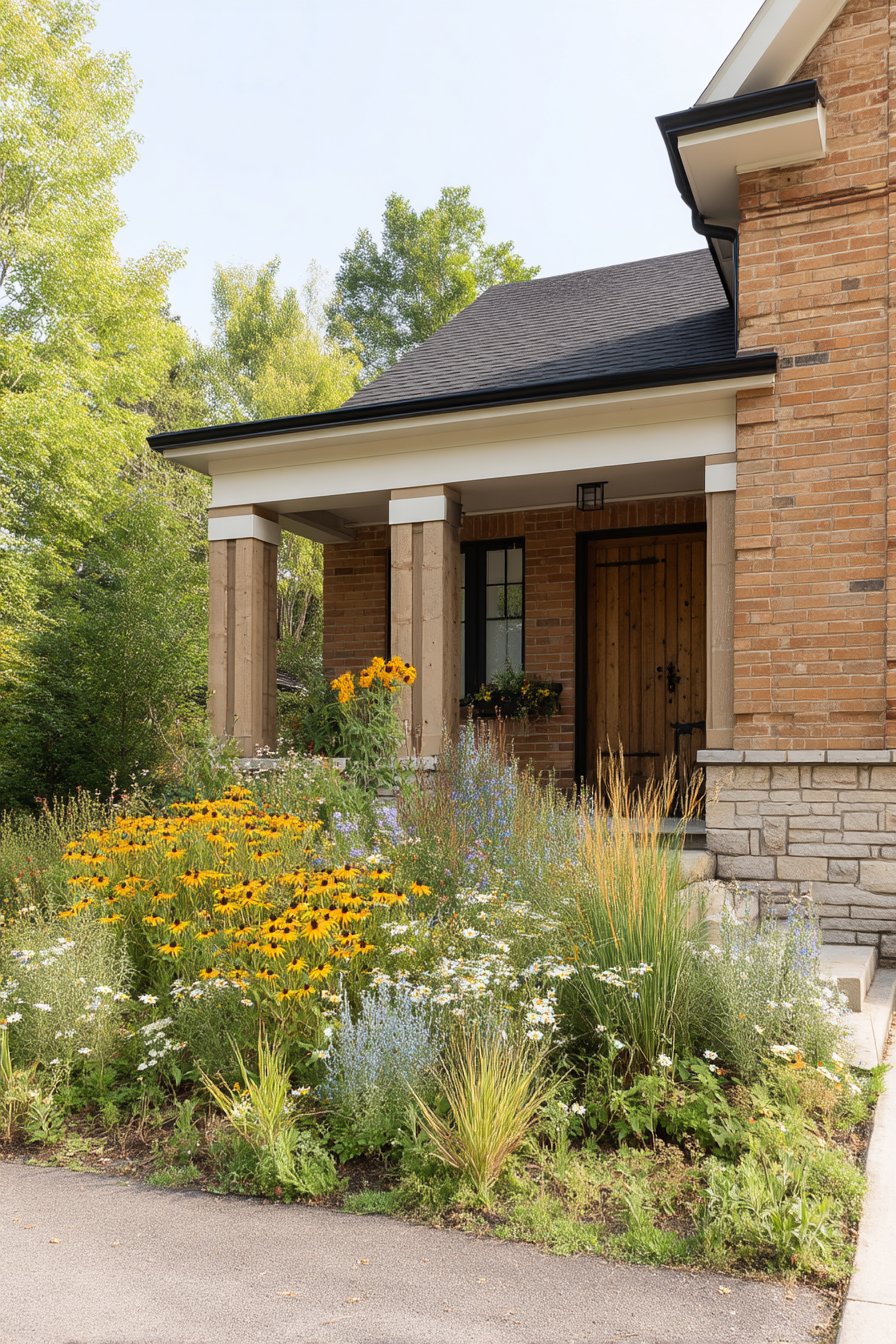 This vibrant garden showcases a lively mix of and daisies, creating a cheerful, welcoming entrance. To achieve a similar look, combine colorful wildflowers with ornamental grasses for texture and seasonal interest.