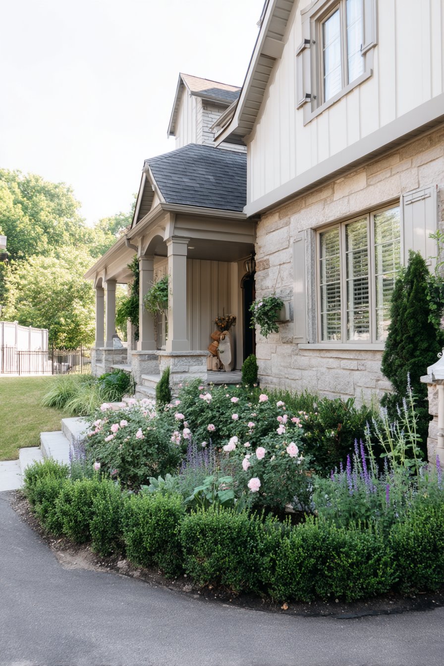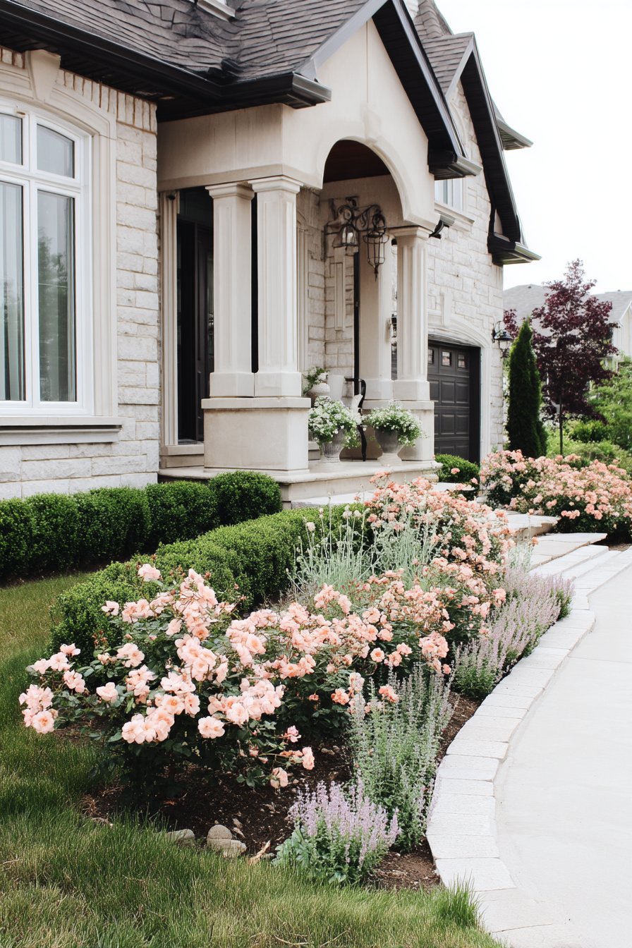 A delightful combination of soft pink roses and fragrant lavender creates a charming border that invites tranquility and beauty. To replicate this look, consider planting low-maintenance boxwood hedges for structure and choose perennials that thrive in your local climate.