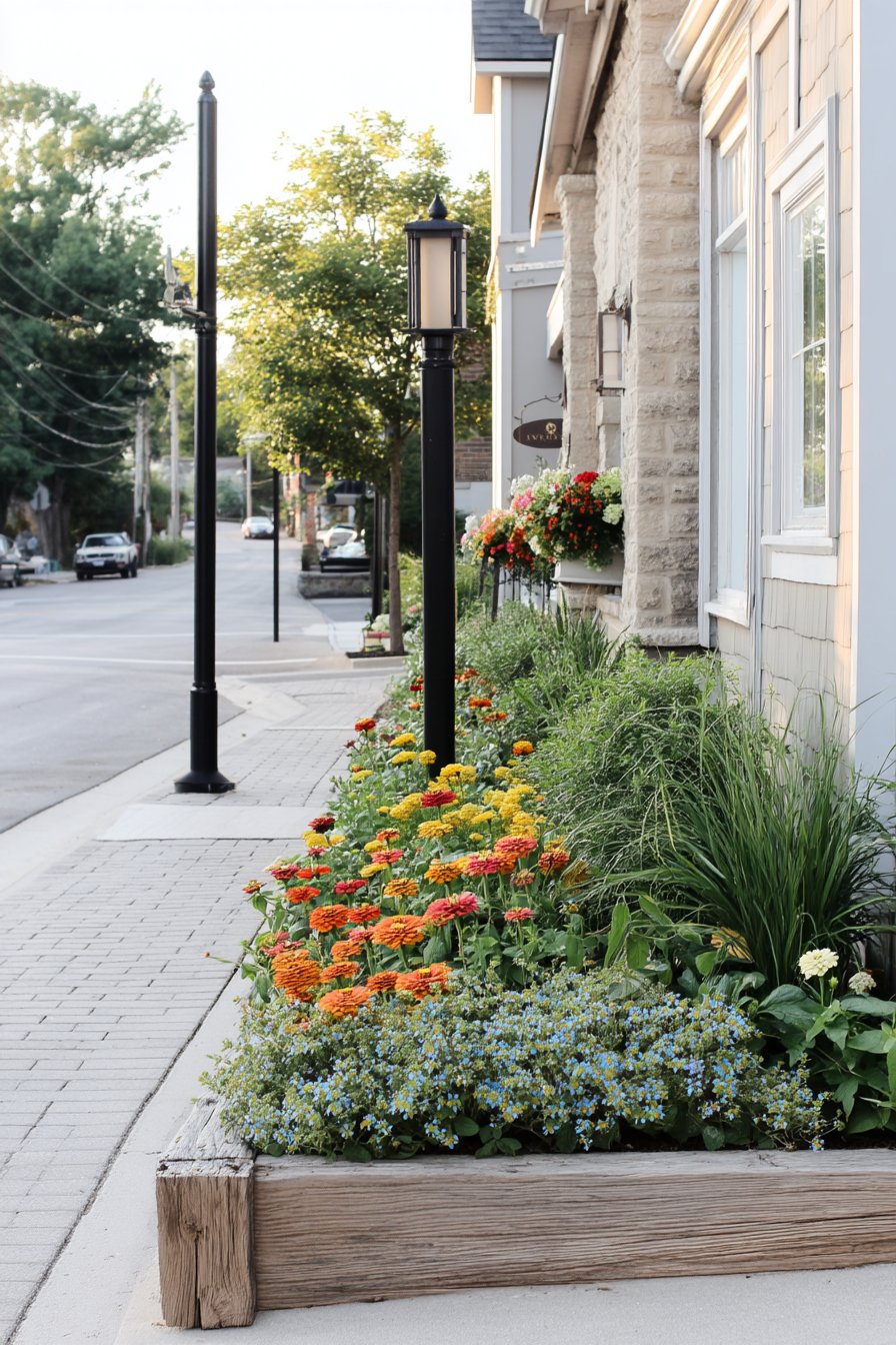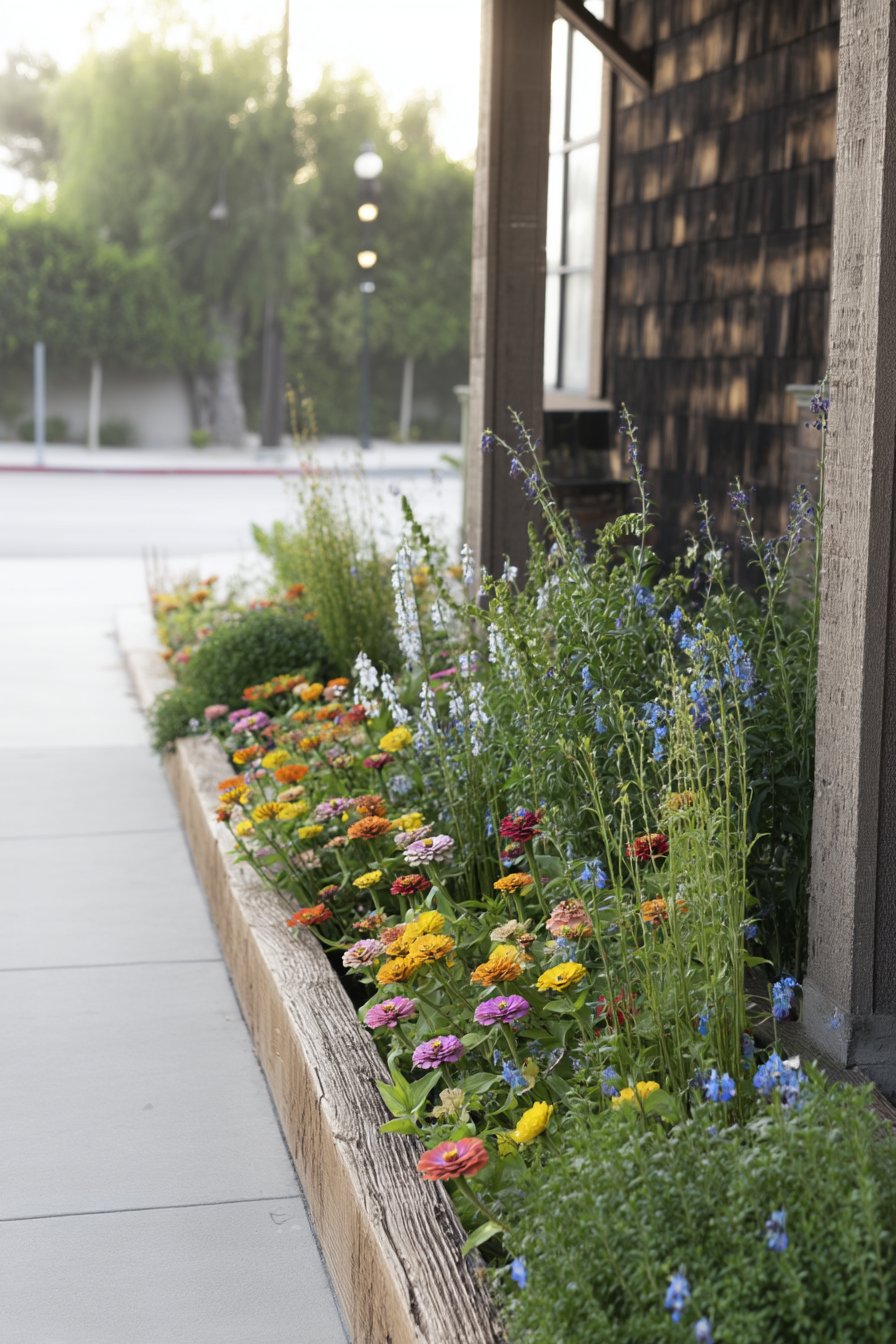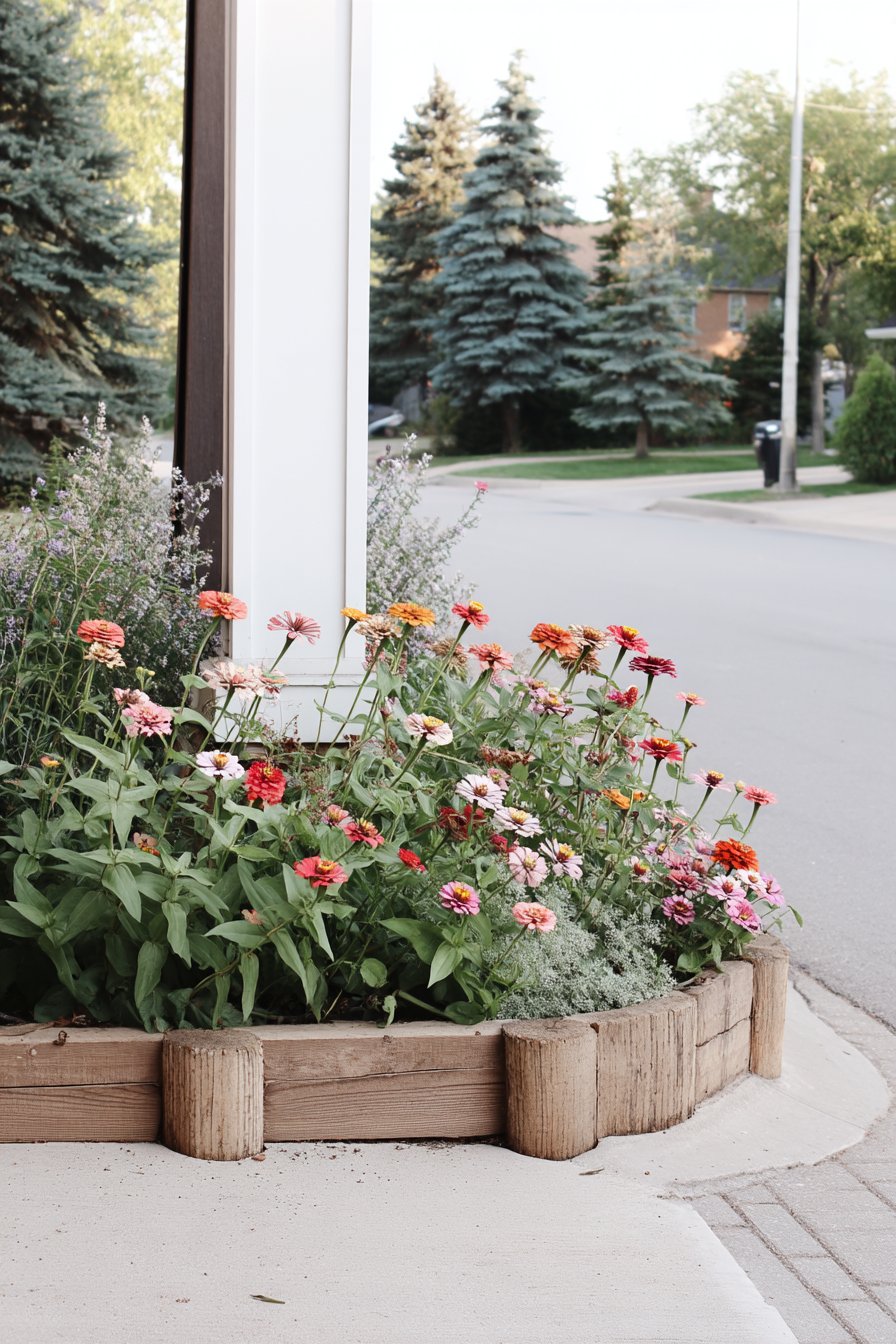 The vibrant zinnias in shades of pink, orange, and red create a lively focal point, perfect for attracting pollinators while adding charm to any space. To replicate this design, consider using a sturdy wooden border for structure and mix in low-growing herbs for added texture and fragrance.