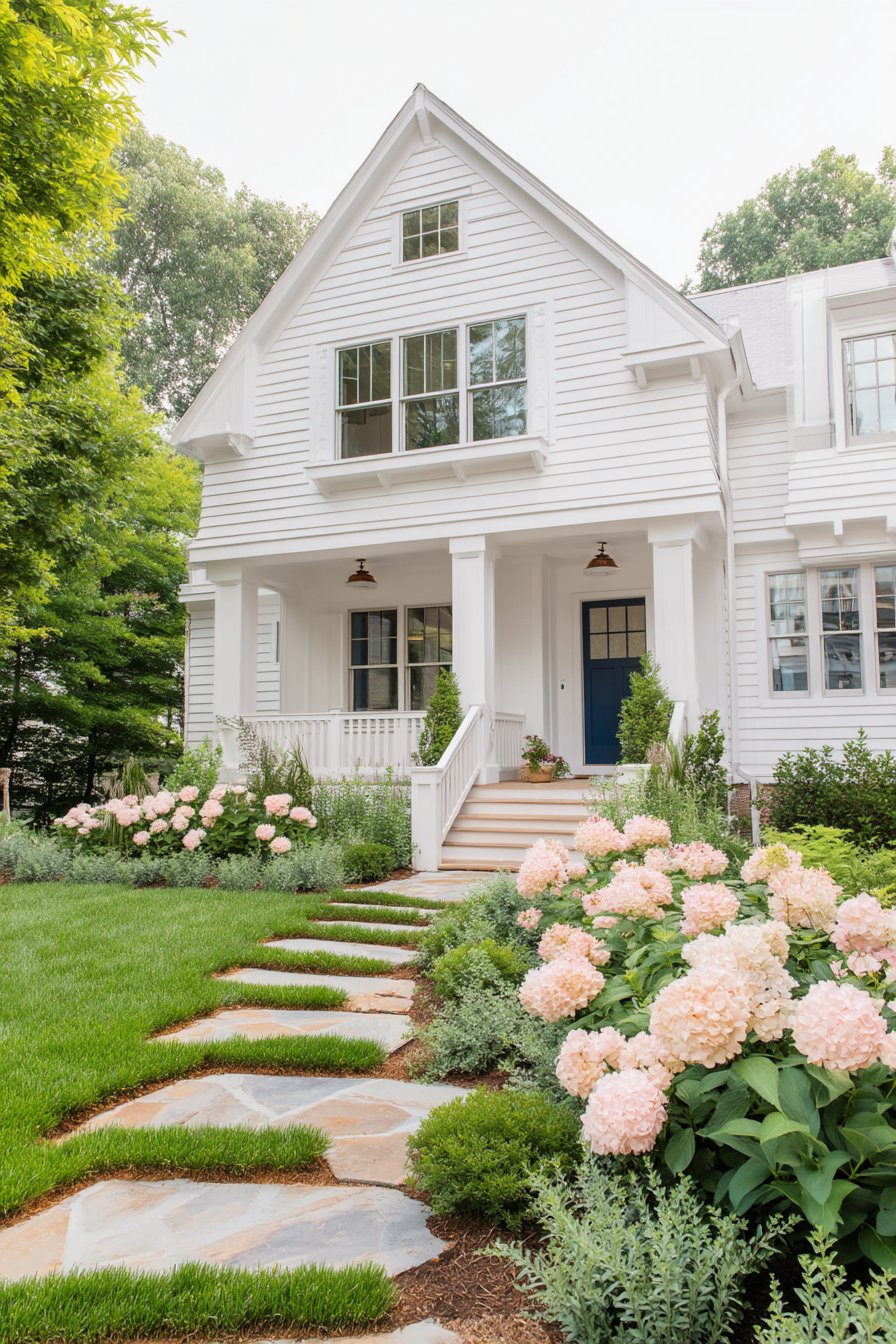 Lush hydrangeas in soft pink hues create a charming focal point, beautifully complemented by neat greenery and stone pathways that invite exploration. For a similar effect, combine flowering shrubs with low-maintenance ground cover and carefully placed stepping stones to enhance accessibility and visual appeal.