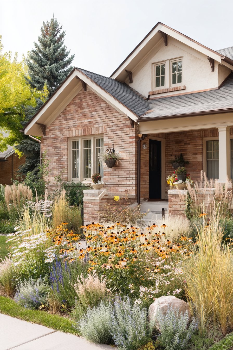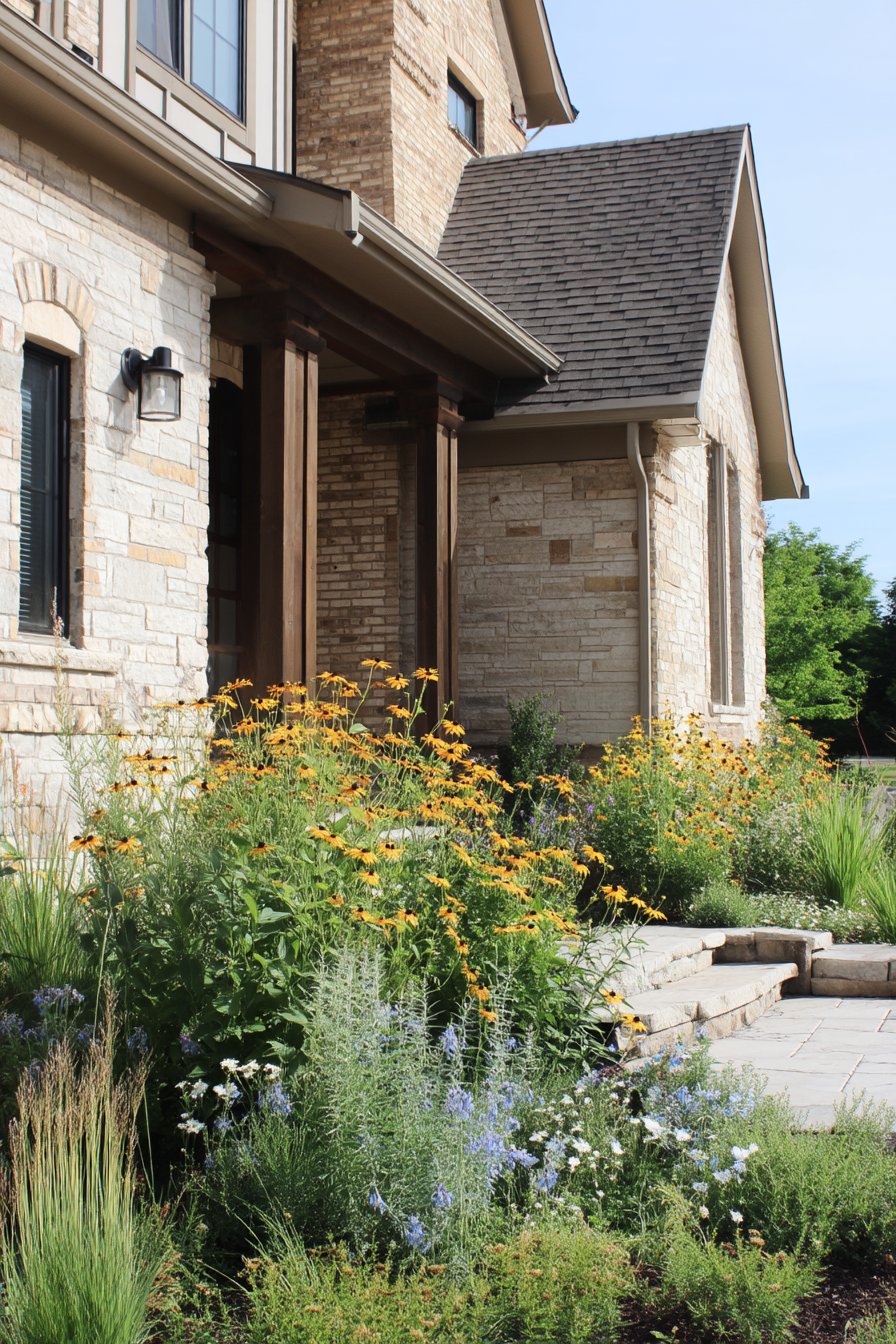 A vibrant display of Black-eyed Susans and delicate grasses creates a lively, inviting atmosphere, perfect for attracting pollinators. To replicate this look, combine bursts of color with varying heights and textures, ensuring a mix of perennials and ornamental grasses for year-round interest.