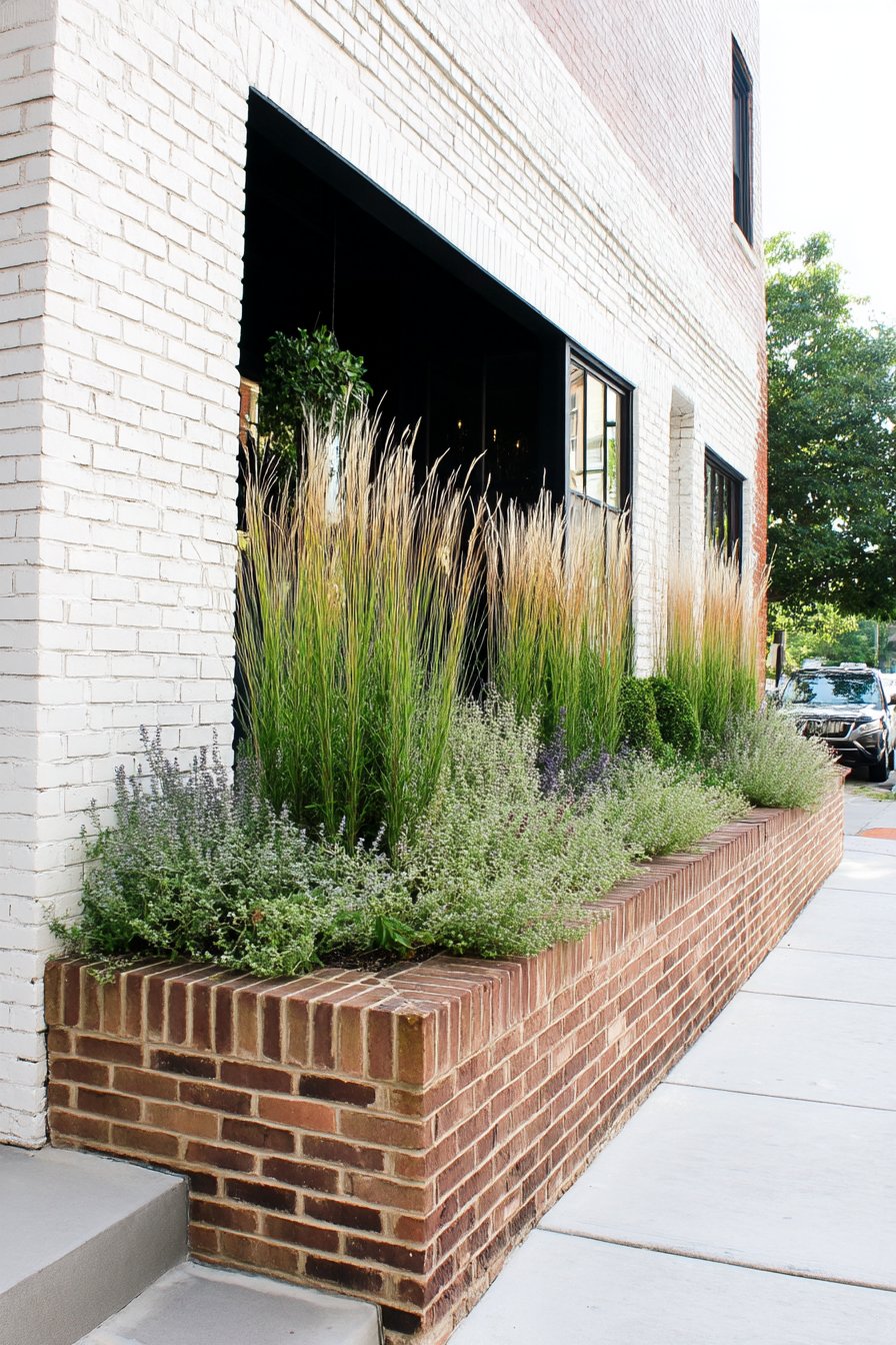 This design beautifully combines tall ornamental grasses with fragrant herbs, creating a serene and inviting atmosphere. To replicate this look, use a mix of feather reed grass and lavender, and consider a low brick border for added structure.