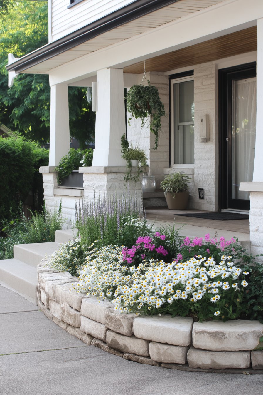 The charming curved stone bed showcases vibrant daisies and pink phlox, creating a lively contrast against lush green foliage. To replicate this look, consider using a mix of perennial flowers and natural stone edging for a cohesive, inviting entrance.