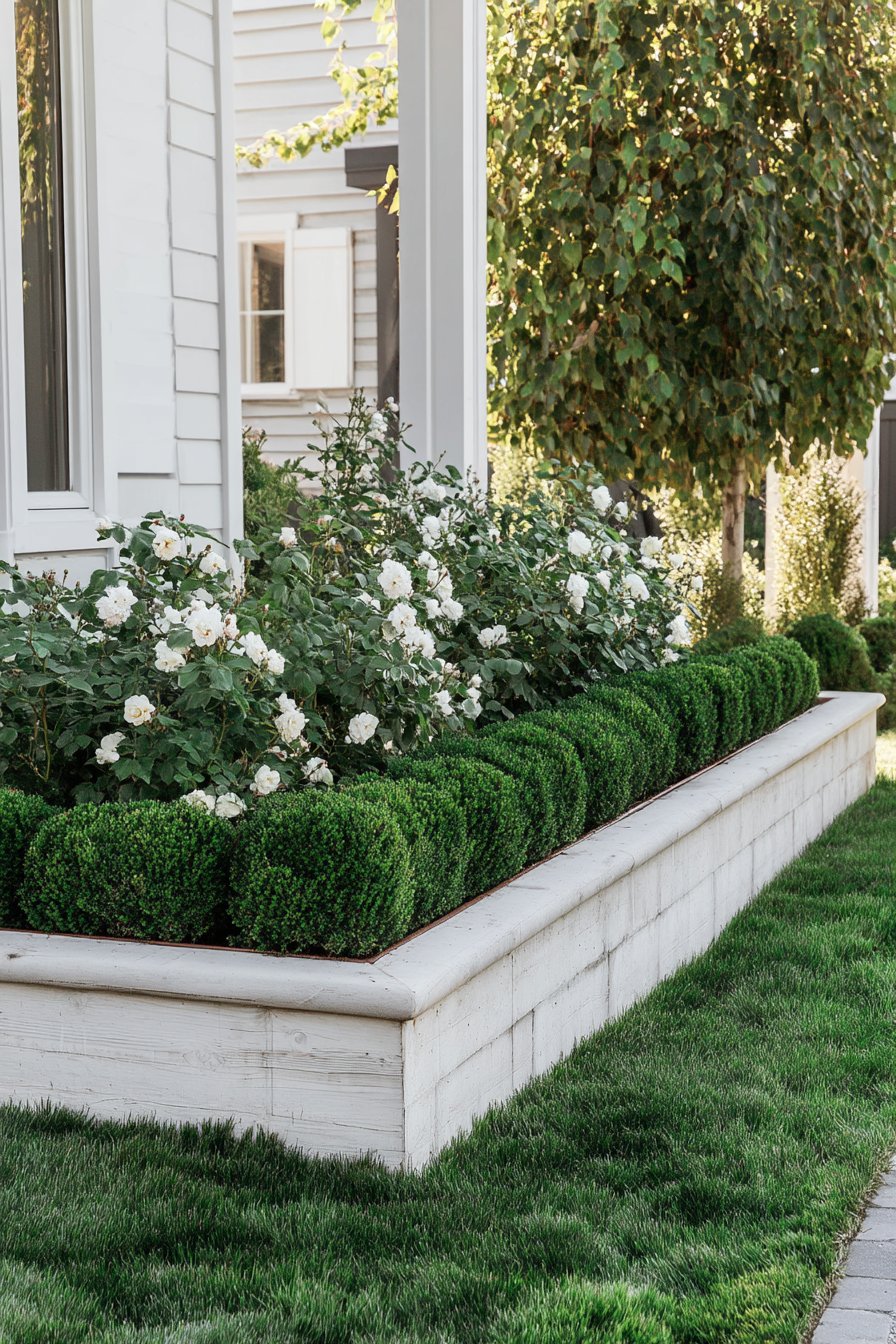 The combination of elegant white roses and neatly trimmed boxwood creates a timeless, sophisticated border that enhances any garden. To replicate this look, plant disease-resistant white roses alongside well-pruned boxwood for a stunning contrast and year-round structure.