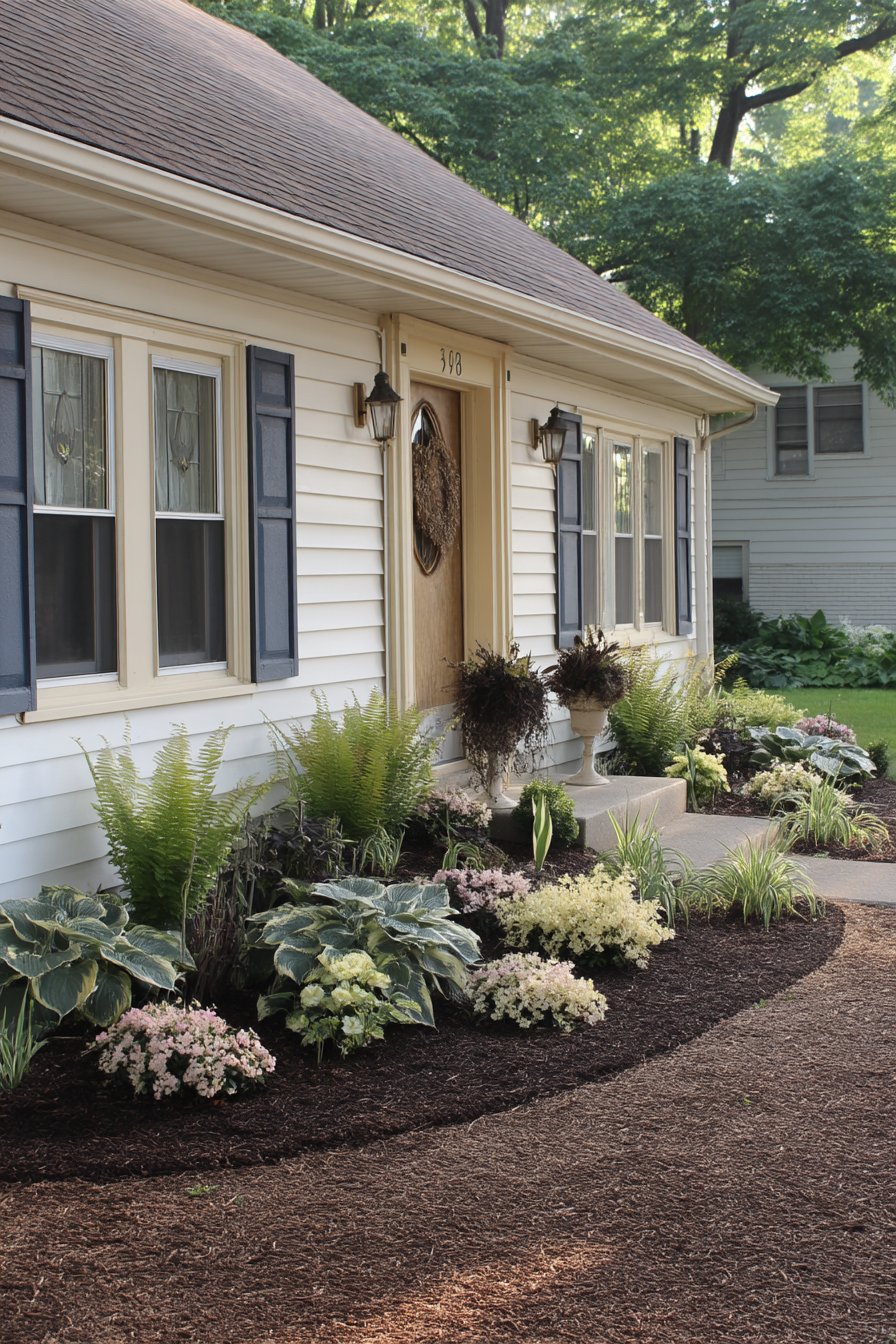 The harmonious blend of lush ferns and soft pastel blooms creates a serene entrance that invites tranquility. To replicate this look, incorporate hostas, astilbes, and low-maintenance mulch for a polished, vibrant garden.