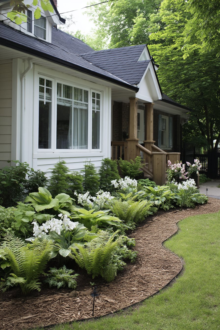 Lush green ferns create a vibrant backdrop for elegant white blooms, offering a serene and refreshing atmosphere. To replicate this look, combine shade-loving ferns with perennial flowers like hostas and use mulch for a polished finish.