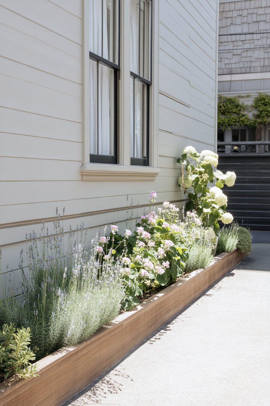 This design beautifully combines lavender and pink flowers, creating a serene and inviting atmosphere perfect for any garden. To replicate this look, use lavender, geraniums, and hydrangeas in a well-structured raised bed for easy maintenance.