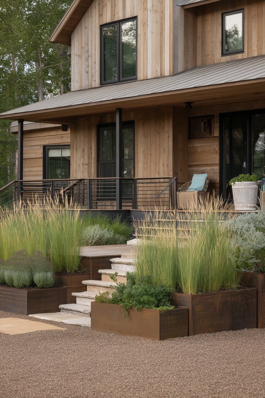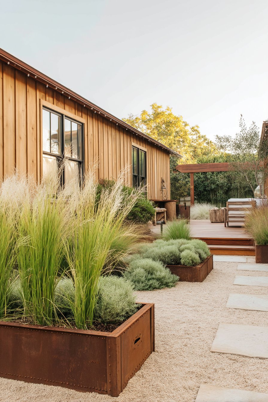 The harmonious blend of warm wood tones and sleek metal accents creates a modern rustic aesthetic, enhanced by lush ornamental grasses and fragrant herbs. For a similar look, incorporate raised planters with drought-tolerant plants and use natural materials for pathways to maintain a cohesive design.