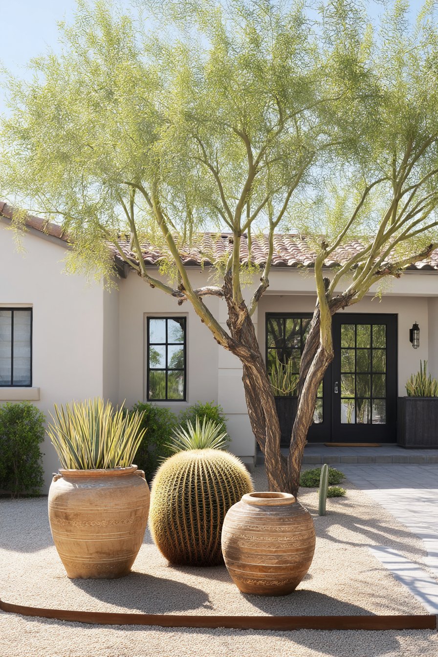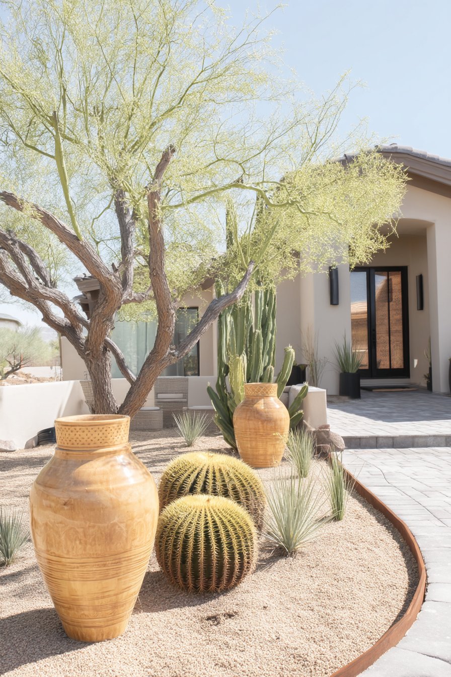 The harmonious blend of textured planters and striking cacti creates a stunning focal point, perfectly suited for a low-maintenance landscape. To replicate this look, incorporate drought-resistant plants like golden barrel cacti and agave, surrounded by gravel for easy drainage.