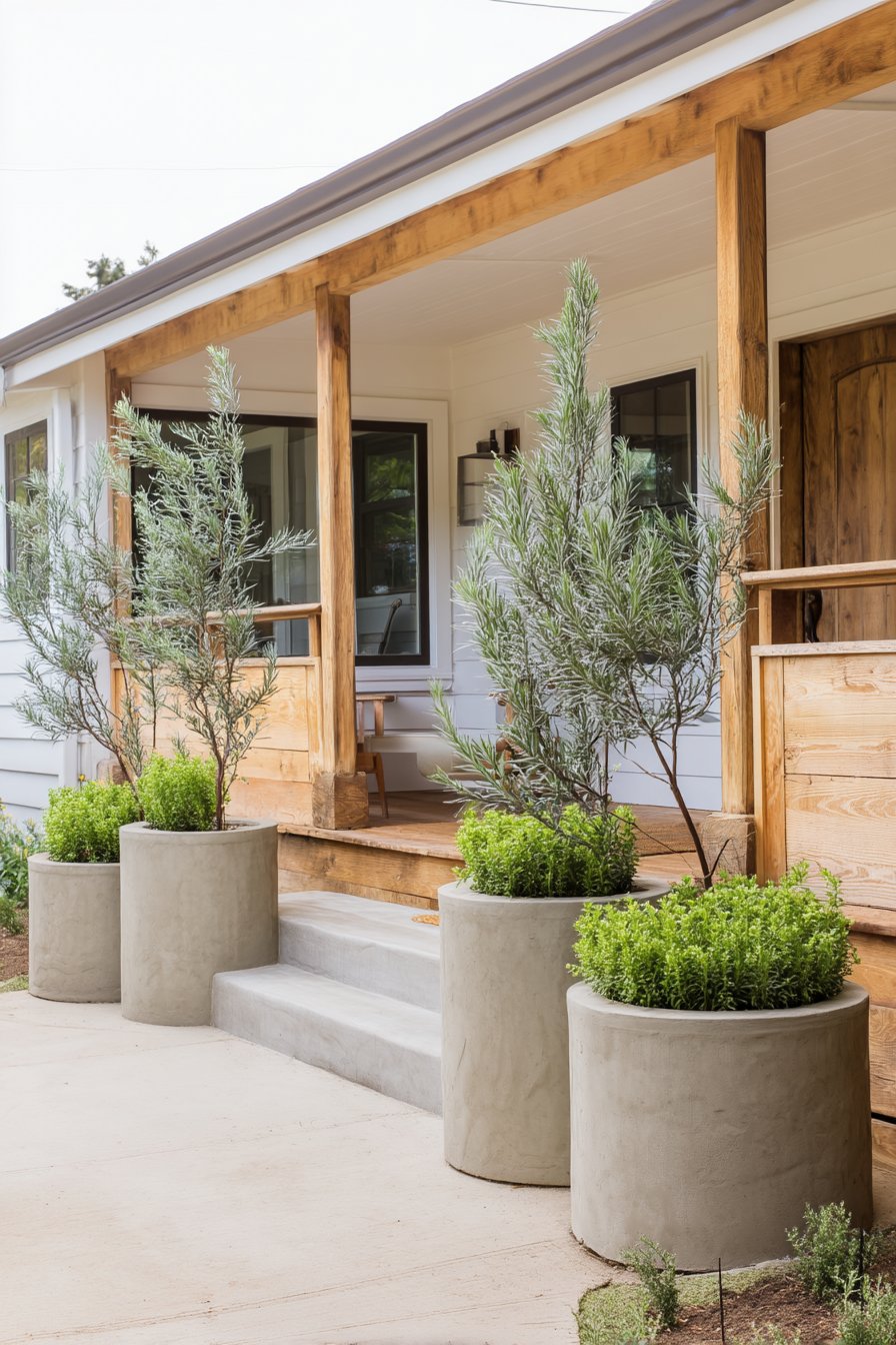 The sleek concrete planters beautifully juxtapose the soft greenery of rosemary and low-maintenance herbs, creating a serene outdoor ambiance. To replicate this look, choose modern planters and pair them with drought-resistant plants for effortless elegance.