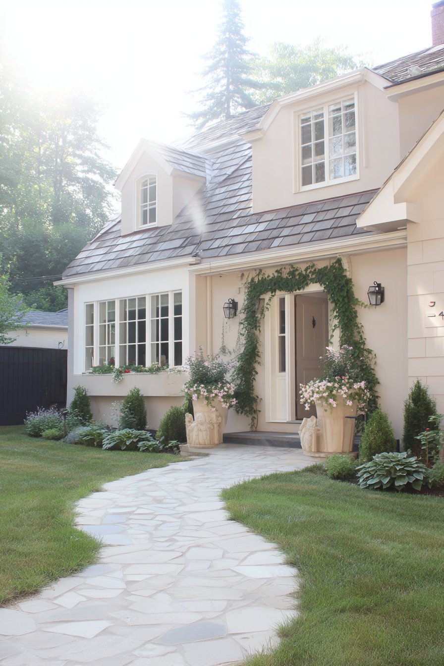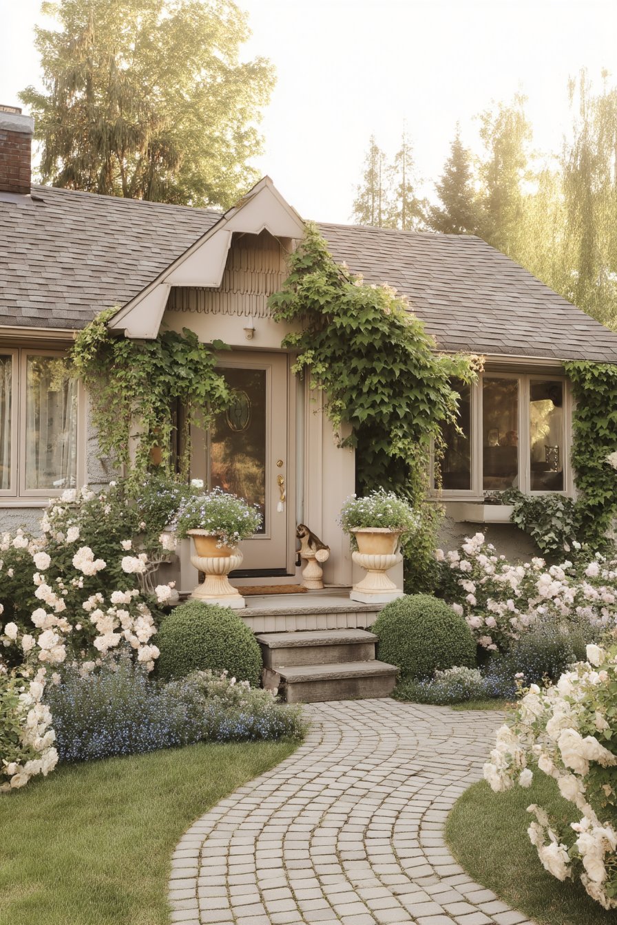 A charming pathway lined with stone invites exploration, flanked by lush greenery and delicate blooms like pink geraniums that add a touch of whimsy. Incorporate ornamental pots and climbing vines to create a welcoming entrance that blends elegance with a cozy cottage feel.