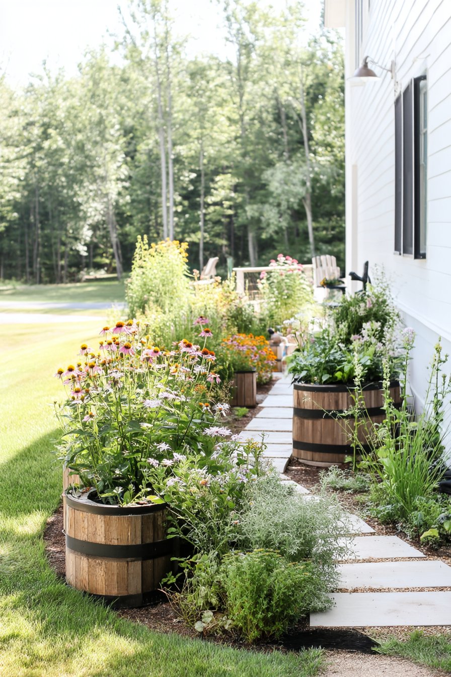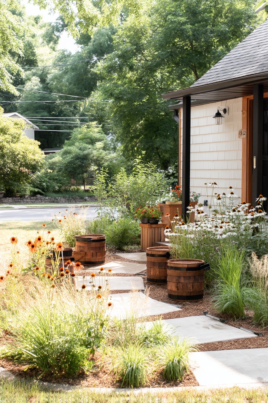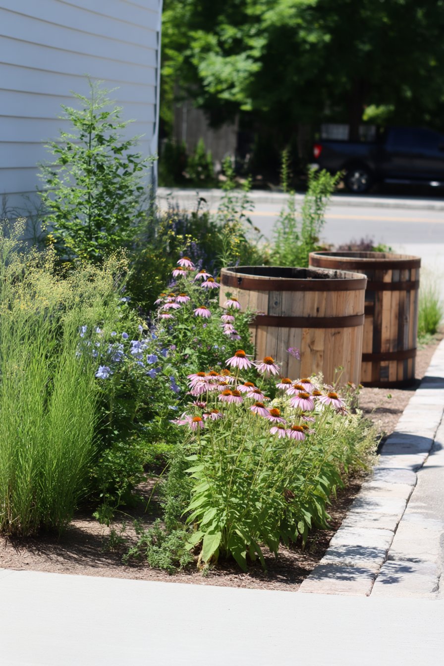 The vibrant mix of echinacea and delicate blue flowers creates a charming, layered effect that invites pollinators into the garden. Incorporate rustic wooden barrels for functional accents while choosing drought-tolerant perennials to ensure low-maintenance beauty year-round.
