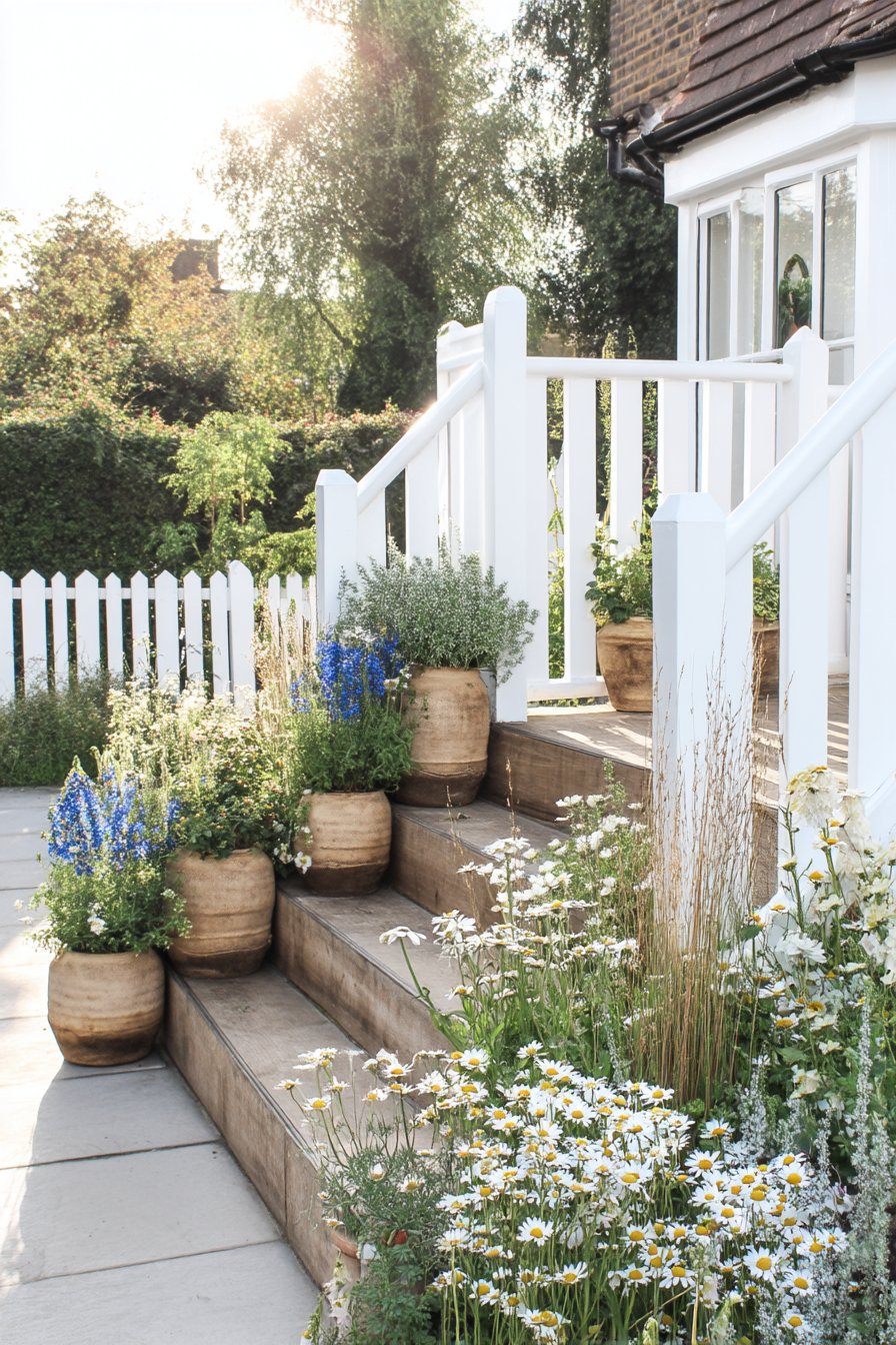 The charming mix of daisies and vibrant creates a delightful contrast, enhancing the rustic vibe of the space. To replicate this look, use an assortment of textured containers and choose a variety of flowering plants that bloom at different times for continuous color.