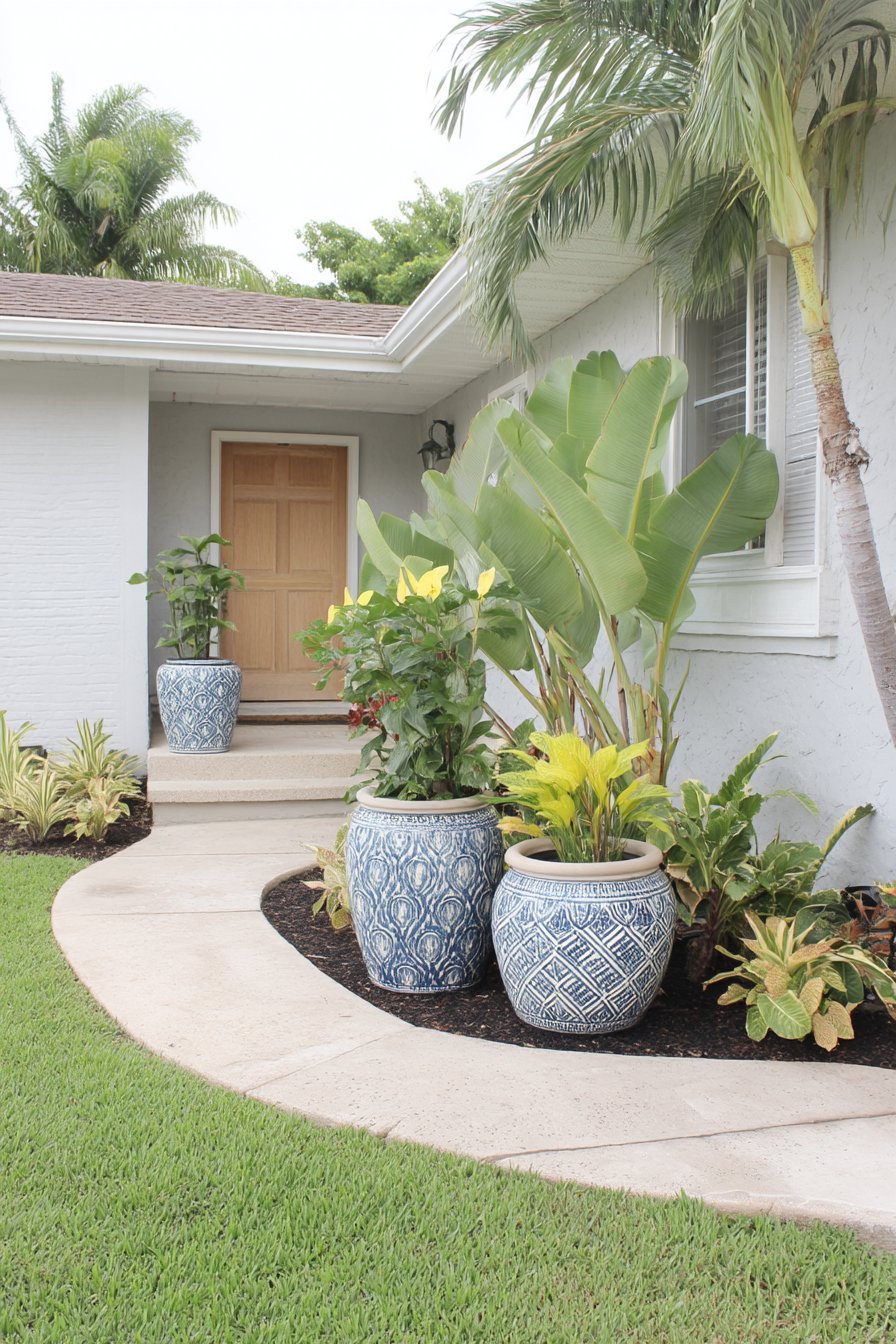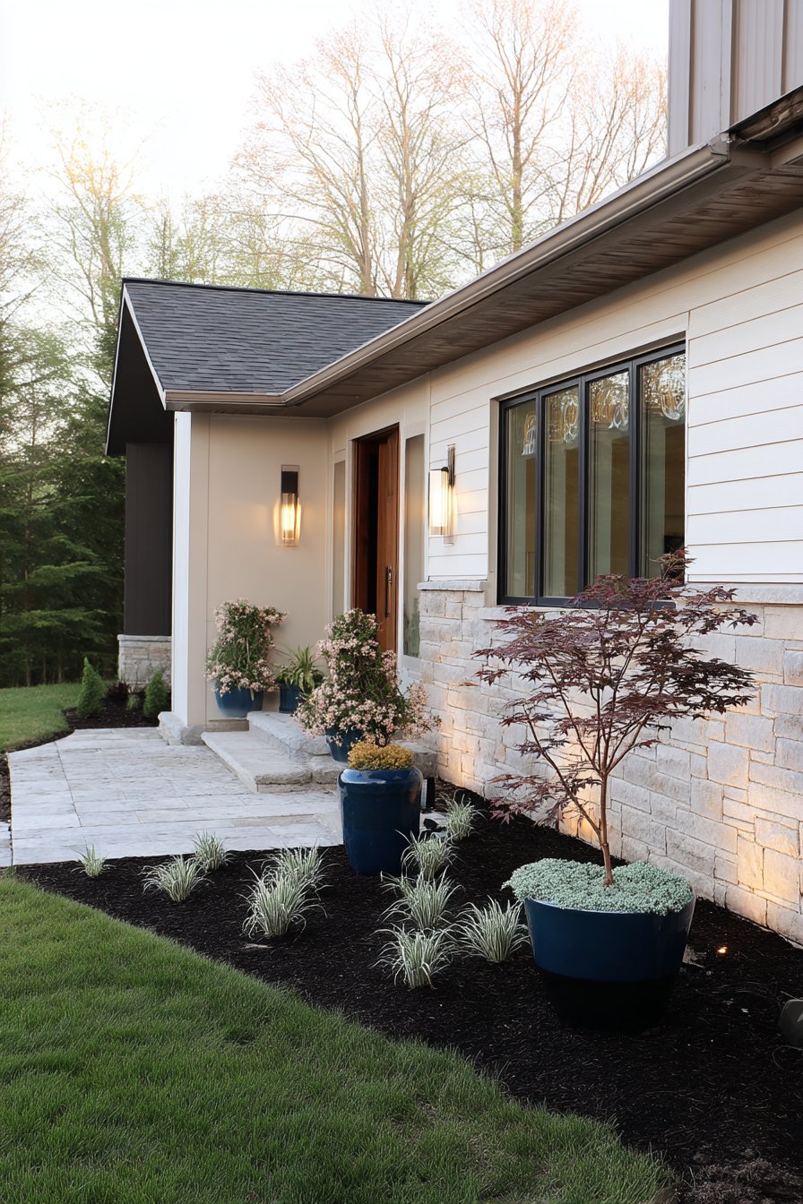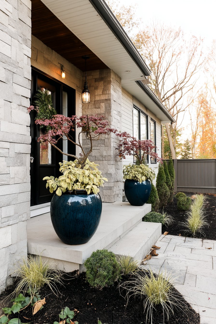 The striking contrast of deep blue planters filled with vibrant foliage creates a welcoming entrance, while the elegant stonework adds a modern touch. Incorporate low-maintenance plants like variegated groundcovers and ornamental grasses for a similar stylish yet practical look.