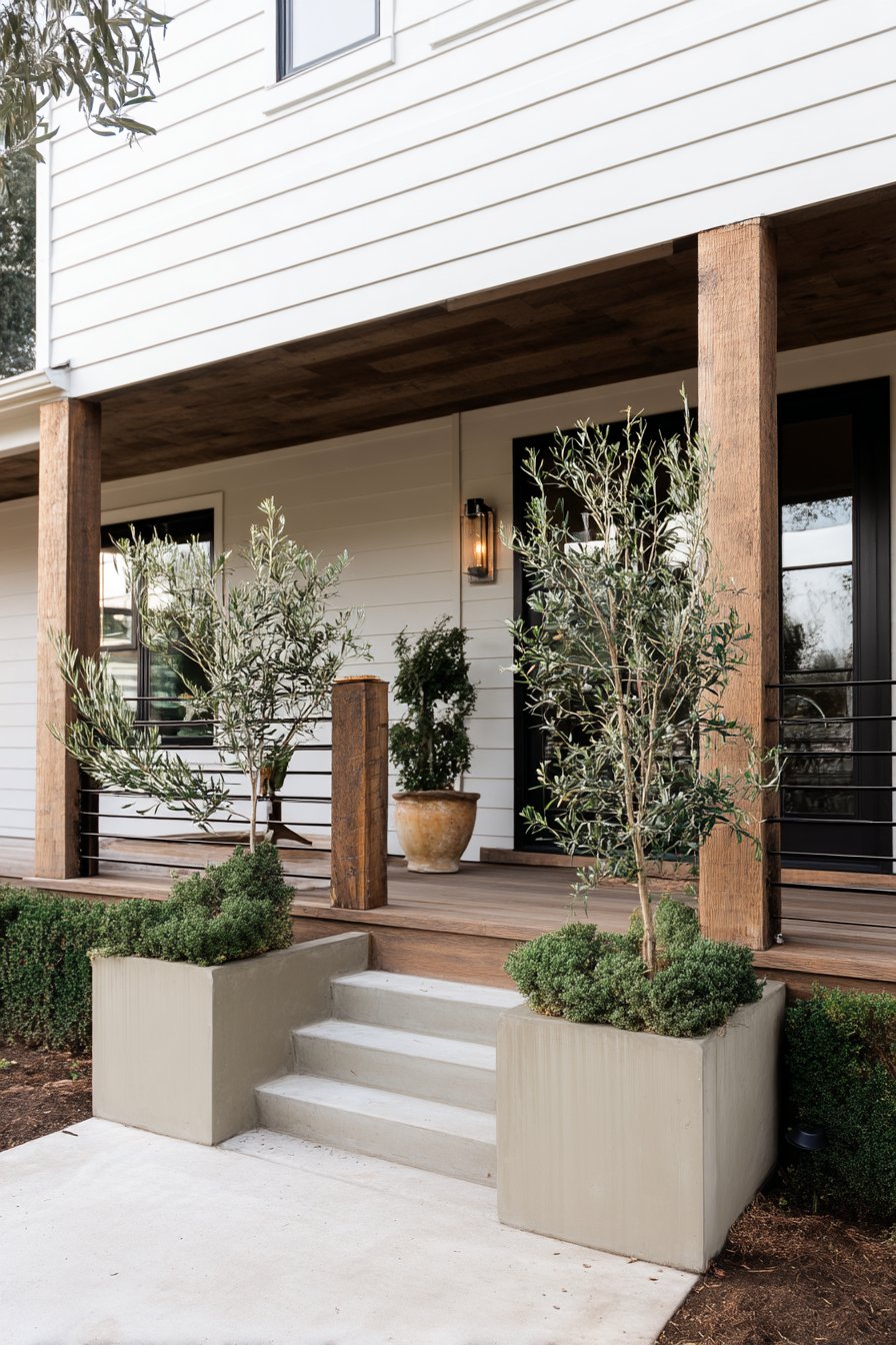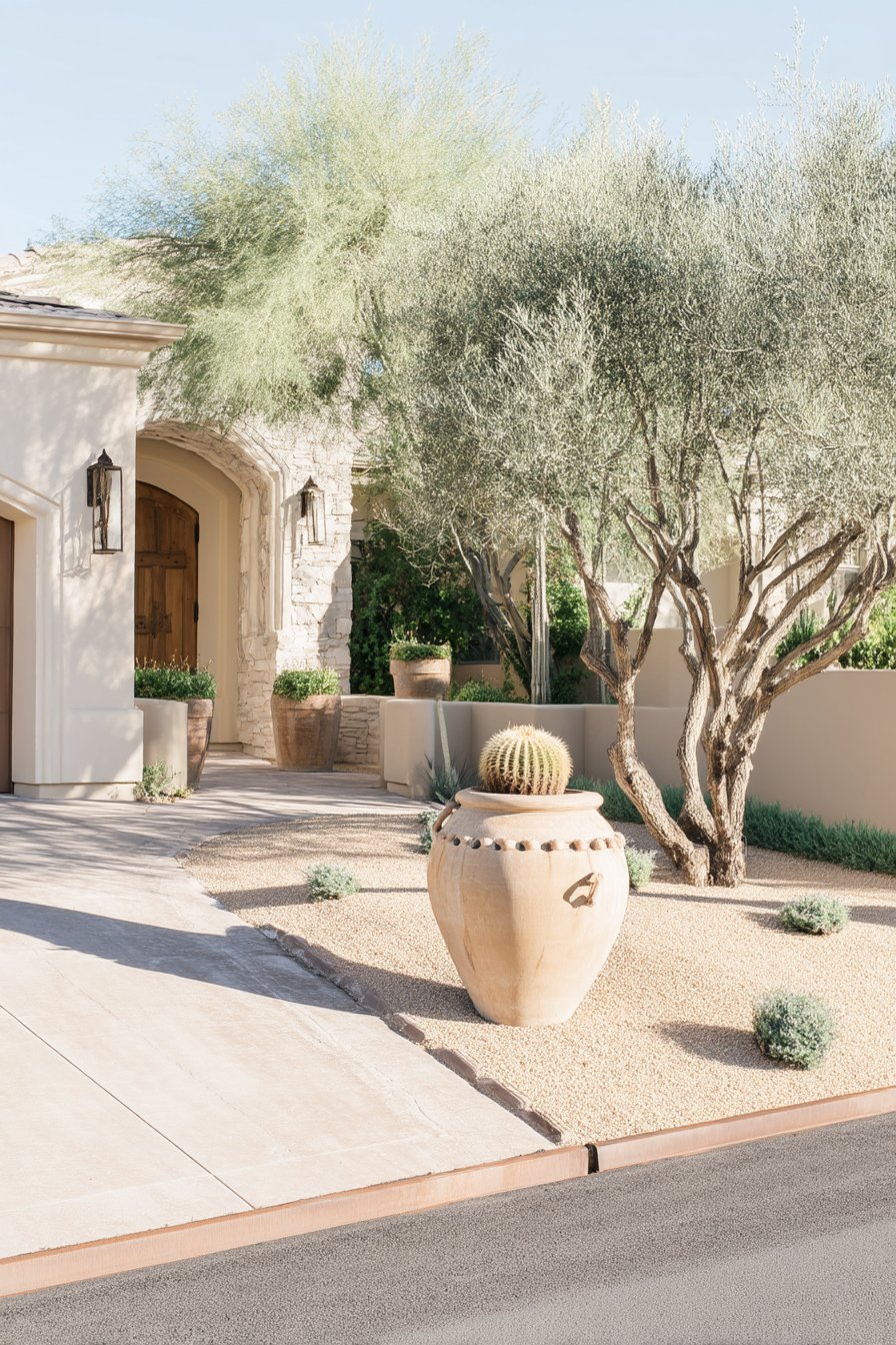 The elegant combination of olive trees and manicured boxwoods creates a serene, minimalist aesthetic perfect for modern spaces. To achieve this look at home, use simple geometric planters and select plants that thrive in your local climate.