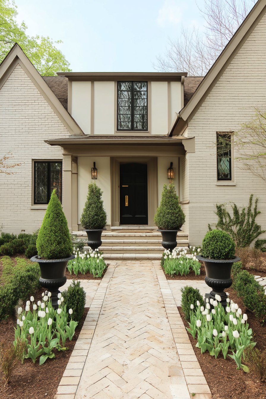 The elegant combination of lush green boxwoods and striking white creates a timeless, formal entryway that welcomes guests with grace. For a similar effect, consider using symmetrical plantings and classic urns to frame your pathway, enhancing visual appeal.